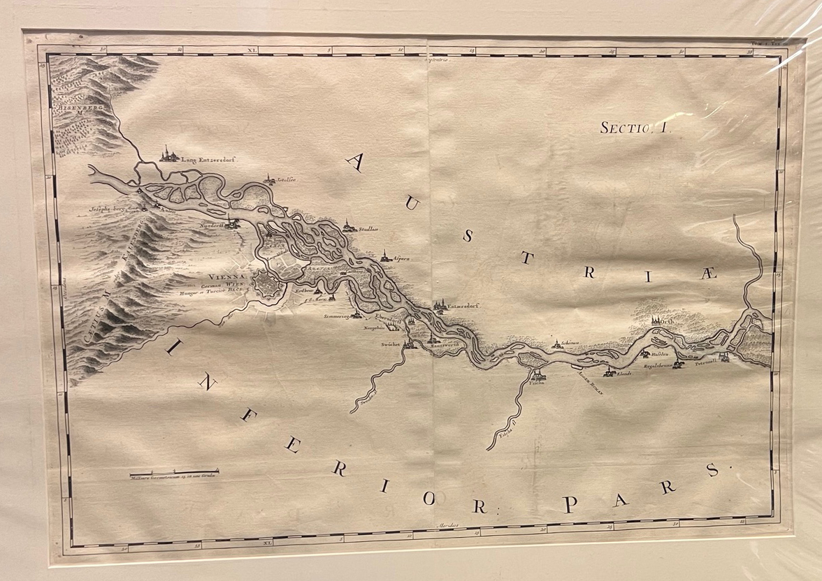 1453-25 MARSIGLI, Luigi Fernando. Austriae Inferior: Pars. Sectio I. Das Blatt stammt aus Luigi Ferdinando Marsiglis (1656-1730) Werk " Danubius Pannonico-mysicus" (Bd.I) und zeigt das Gebiet von Bisamberg/Lang Entzersdorf (Langenzersdorf) bis Petronell. Wien ist mit Beschriftungen in unterschiedlichen Sprachen versehen "Vienna, German: Wien, Hungar. et Turicè: Becs", zudem dargestellt ist die Leopoldstadt, der Prater ("Brater") mit dem Lustschloss, der St. Brigitta Tempel, "Erdbeer" (Erdberg), Simmering, Neugebäude. | ||
