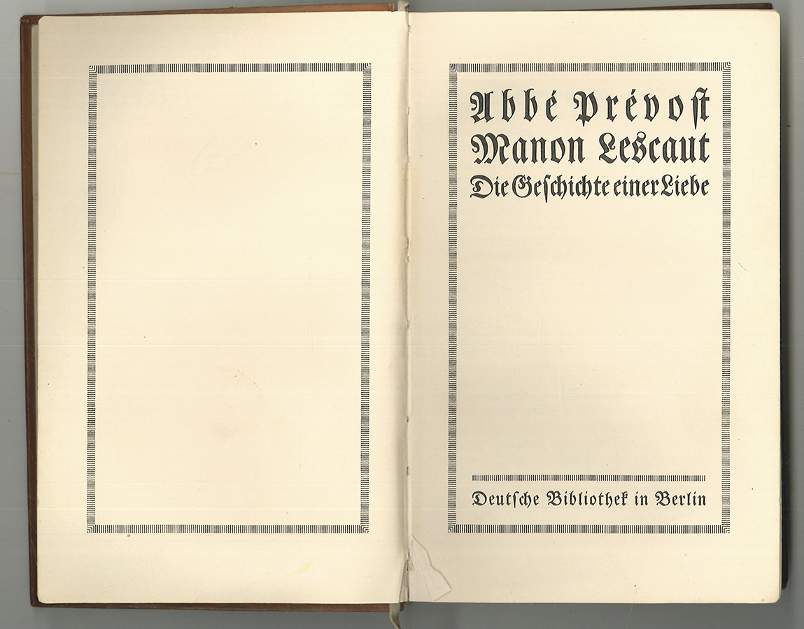 Manon Lescaut. Die Geschichte einer Liebe.Bln., Schreiter o. J. [ca. 1928]. 8°. XVI, 245 (1) S. OLdr. Mit Goldpräg. u. Kopfrgoldschn. Berieb.