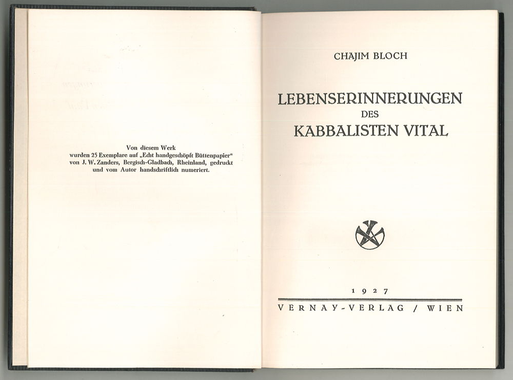 1472-25BLOCH, Chajim. Lebenserinnerungen des Kabbalisten Vital.Wien, Vernay-Vlg. 1927. 8°. 179 S. OPbd. m. Goldpräg. Rü. berieb.