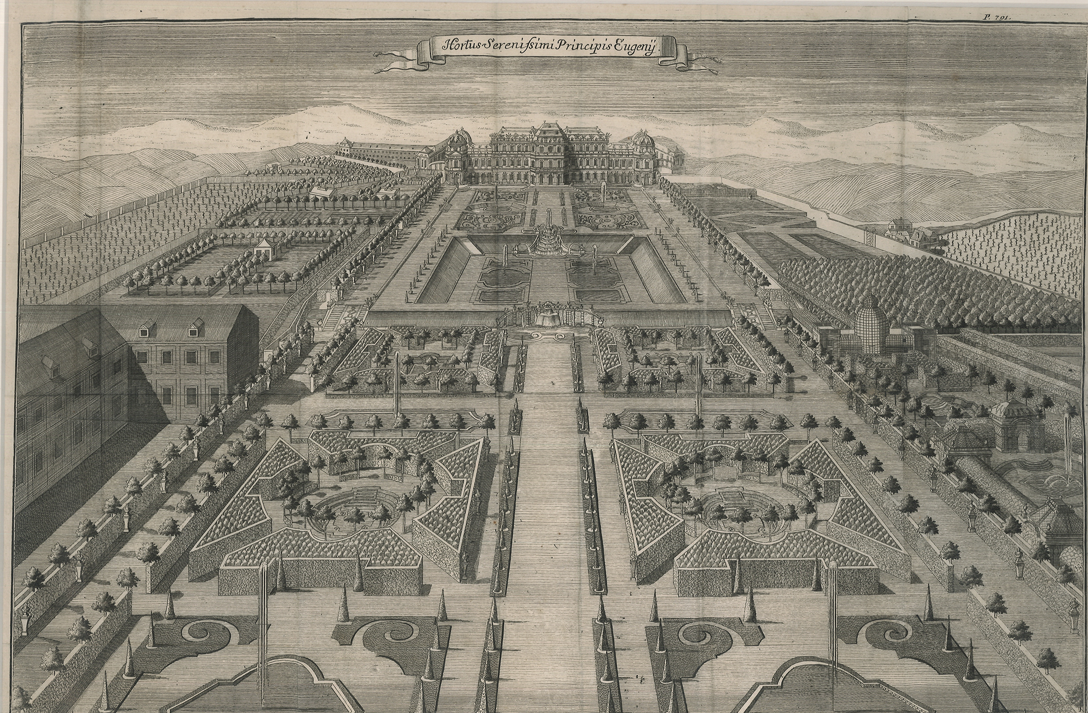 1481-25 BELVEDERE - SCHMIDT, Johann Georg. Hortus Serenissimi Principis Eugenii. [Schloss Belvedere mit den Gartenanlagen]. Nebehay-Wagner 324, 9 - Eindrucksvolle Ansicht des Schlosses Belvedere mit den barocken Gartenanlagen und Springbrunnen (heute: 3. Wiener Gemeindebezirk), der damaligen Sommerresidenz des Prinzen Eugen (1663-1736). Der Kupferstich stammt von Johann Georg Schmidt. Aus: Johann Basilius Küchelbecker: Allerneueste Nachricht vom Römisch-Käyserl. Hofe. Nebst einer ausführlichen historischen Beschreibung der Kayserlichen Residentz-Stadt Wien, Hannover 1730. | ||