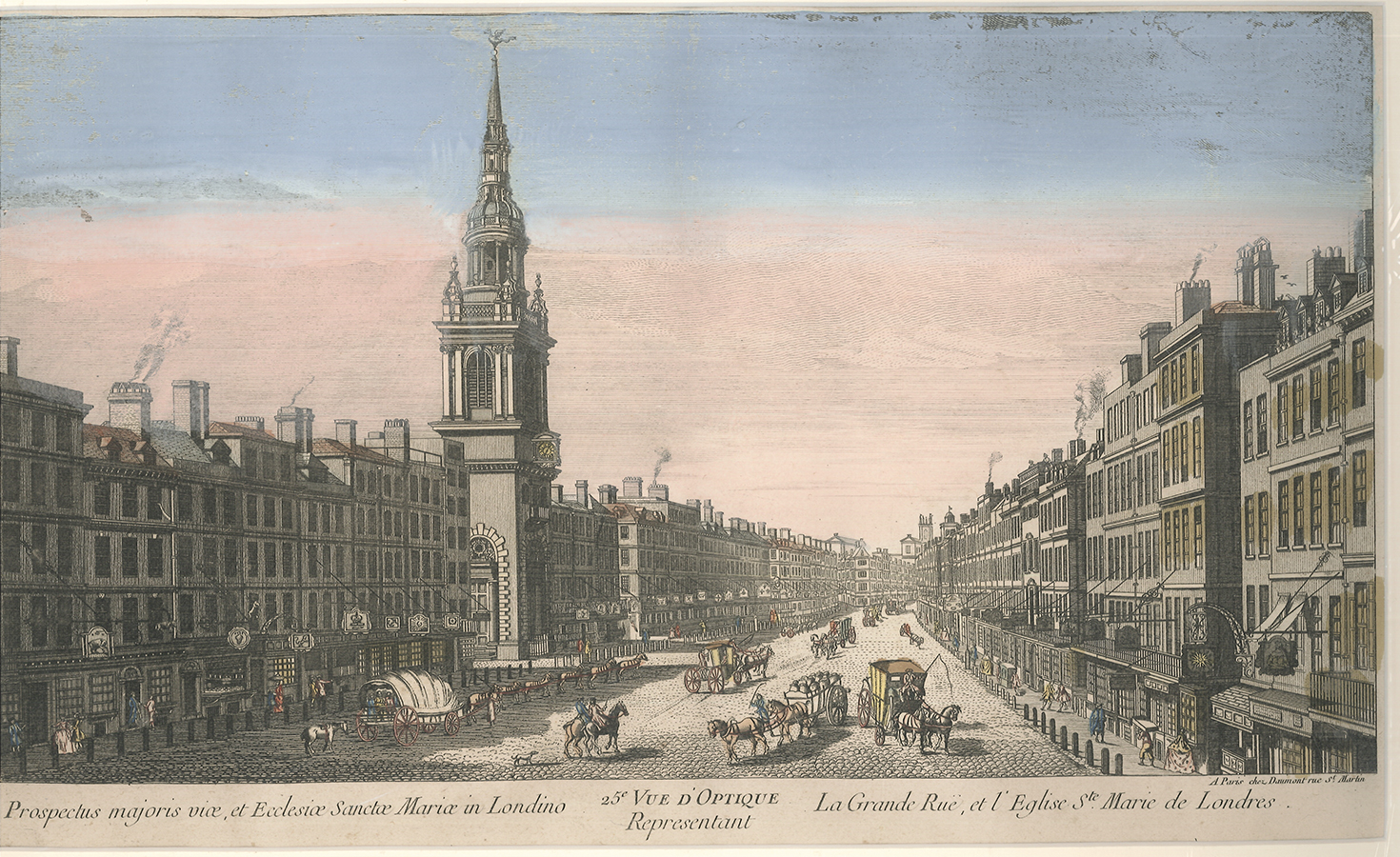 1492-25 LONDON - 25e Vue d'Optique representant: Prospectus majoris viae, et Ecclesiae Sanctae Mariae in Londino/La Grande Rue, et l'Eglise Ste. Marie de Londres. Clayton, English Print 1688-1802, 140-141 - Ansicht der Kirche St.Mary-le-Bow an der Cheapside in London. | ||