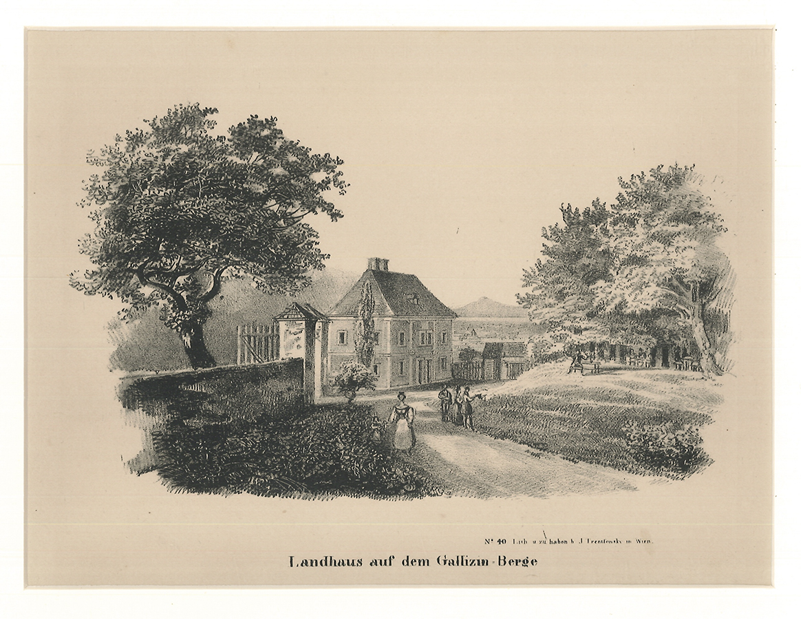 Landhaus auf dem Gallizin Berge.Lithographie. Wien, [um 1830-40]. 15 x 20 cm. (Bildausschn.). Unter Passepartout. Gut erhalten, minimal gebräunt.