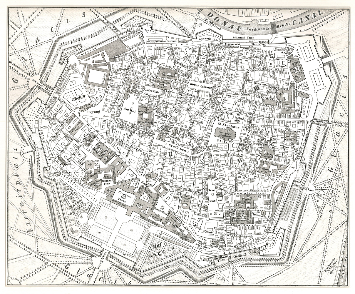 1523-25 WIEN - Plan der Inneren Stadt. Nebehay-Wagner 935, 24 (1856) - Plan der Inneren Stadt (heute: 1. Wiener Gemeindebezirk) mit den alten Stadtmauern. Aus: M. Auer's "Faust-Poligrafisch-illustrierte Zeitschrift", Wien 1853. Am unteren Rand im Stein signiert u. datiert "1853". | ||