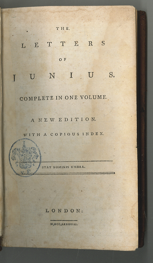 Anonym gedruckte Ausgabe der "Letters of Junius", die erstmals 1772 erschienen sind. Hinter dem Pseudonym "Junius" verbirgt sich möglicherweise der Politiker Philip Francis (1740-1818).