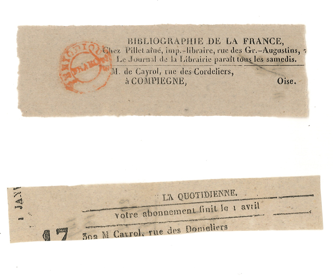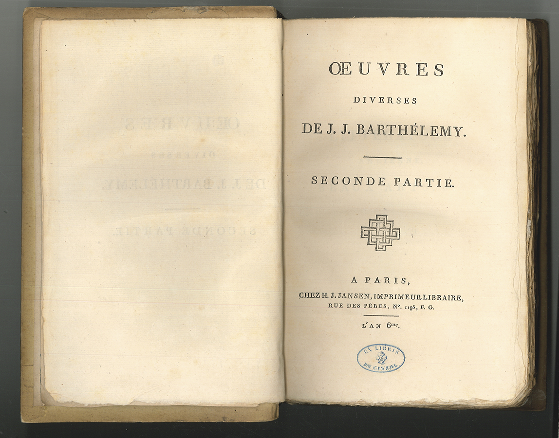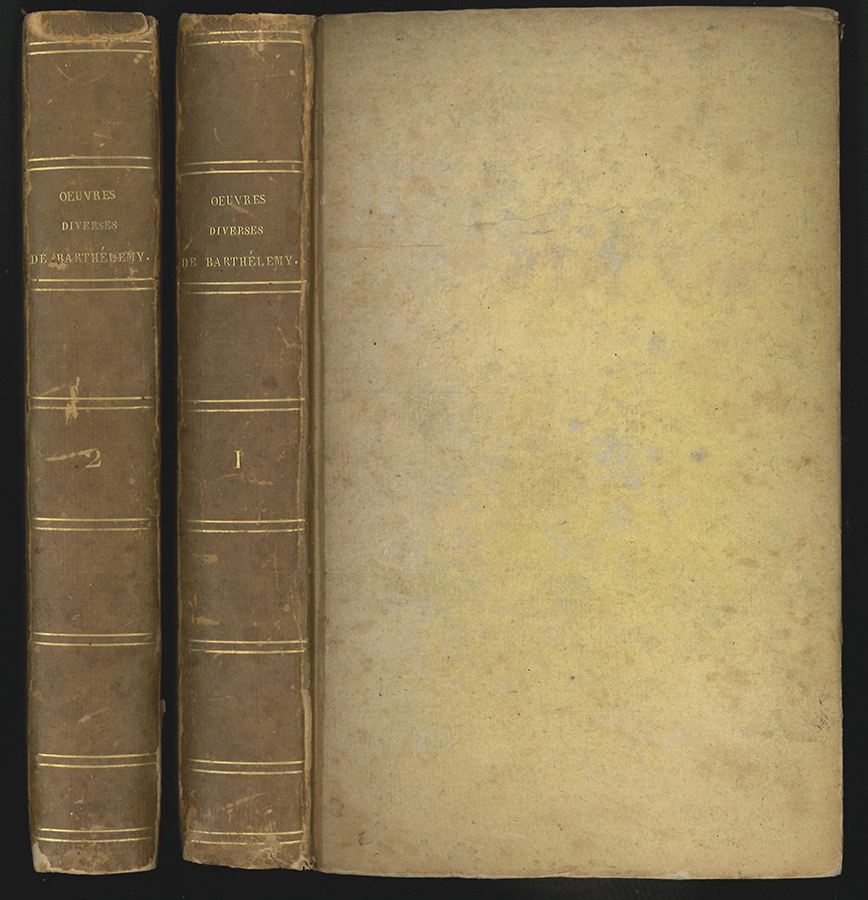 1564-25 BARTHELEMY, J[ean] J[acques]. Oeuvres diverses. EA. - Erstausgabe der 2-bändige Werkausgabe von Jean-Jacques Barthélemy (1716-1795), der als Altertumsforscher, Numismatiker und Gräzist u. a. Mitglied der Académie française war. Eine der Tafeln zeigt einen Museumsplan "Plan de la Galerie de Florence". Aus dem Besitz des französischen Politikers Louis Nicolas Jean Joachim de Cayrol (1775-1859). Es liegen mehrere, teils gestempelte Streifbandzettel an de Cayrol bei, die an ein auslaufendes Abonnement erinnern. Im gleichen Jahr erschien auch eine 4-bändige Ausgabe, ebenfalls bei H. J. Hansen. | |||||