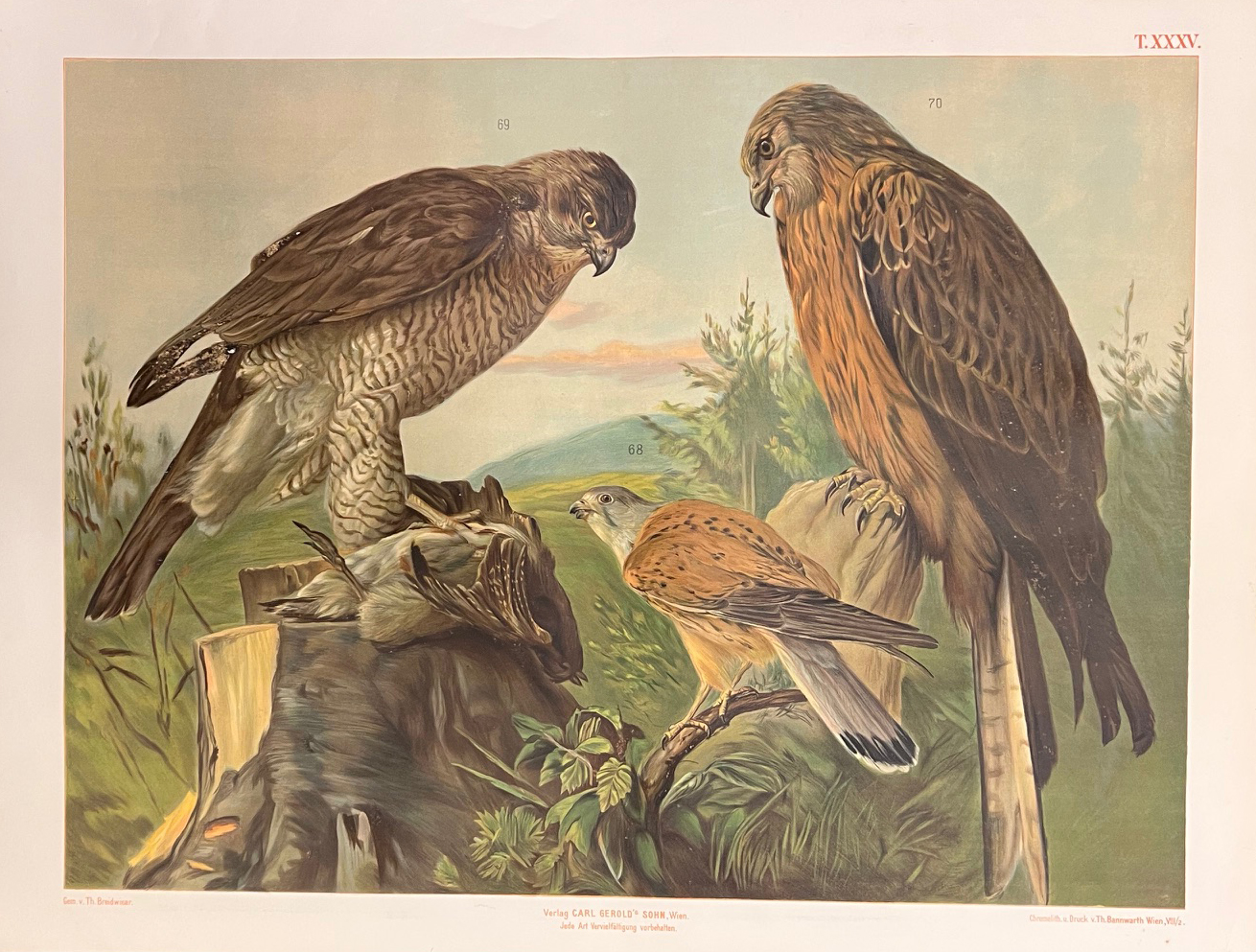 1570-25 [Turmfalke]. Eine von Hartingers Wandtafeln (Nr. XXXV) für den naturgeschichtlichen Anschauungsunterricht die ab 1880 in dem Wiener Verlag Gerold's Sohn heraugebracht wurden. "Bis 1892 erschienen 105 Tafeln in drei Abteilungen: I. Zoologie - II. Botanik - III. Bäume. Die Tafeln sind in Chromolithographie gedruckt. dabei wurden oft bis zu 8 oder 10 Farben verwendet". (vgl. F. C. Heller ausführl. im Katalog 34 des Antiquariats Löcker, ca. 1985) Theodor Breidwiser (auch Breidwieser oder Breitwieser, 1847-1930) arbeitete auch als Genre- und Militärmaler. | ||
