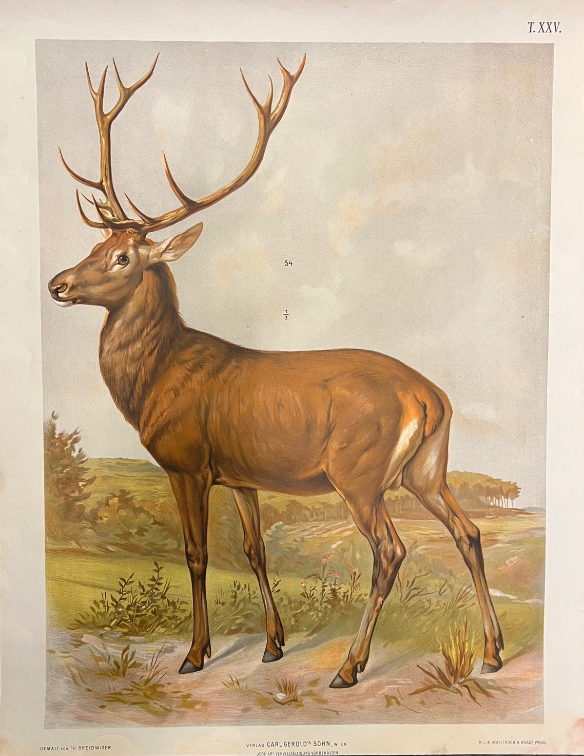 1571-25 [Edelhirsch]. Eine von Hartingers Wandtafeln (Nr. XXV) für den naturgeschichtlichen Anschauungsunterricht die ab 1880 in dem Wiener Verlag Gerold's Sohn heraugebracht wurden. "Bis 1892 erschienen 105 Tafeln in drei Abteilungen: I. Zoologie - II. Botanik - III. Bäume. Die Tafeln sind in Chromolithographie gedruckt. dabei wurden oft bis zu 8 oder 10 Farben verwendet". (vgl. F. C. Heller ausführl. im Katalog 34 des Antiquariats Löcker, ca. 1985) Theodor Breidwiser (auch Breidwieser oder Breitwieser, 1847-1930) arbeitete auch als Genre- und Militärmaler. | ||