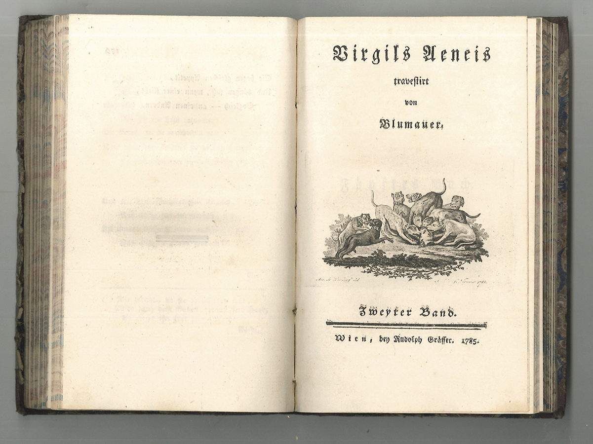 1592-25 BLUMAUER, [Alois]. Virgils Aeneis travestirt. Erstausgabe. Die ersten beiden Bände von Alois/Aloys Blumauers (175-1798) Werk "Virgils Aeneis travestirt". Die gestochene Vignette des 2. Bandes stammt von Jakob Adam. Ein Bleistifteintrag am Spiegel schreibt das gestochene Exlibris "Fischer" dem Hof-Kupferstecher Josef Fischer (1769-1822) zu. | ||||