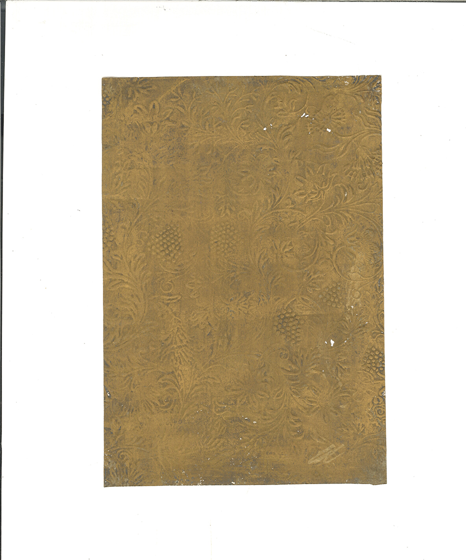 1597-23Geprägtes goldfarbenes Papier.[o. O., frühes 19. Jahrhundert?]. 17, 6 x 12,1 cm. (Gesamtgr.). Wenige kleine Löchlein, teils leicht berieben. Gänzlich goldfarbenes, geprägtes Papier. Mit reichem, floralen Dekor mit kleinen Blüten und Trauben.