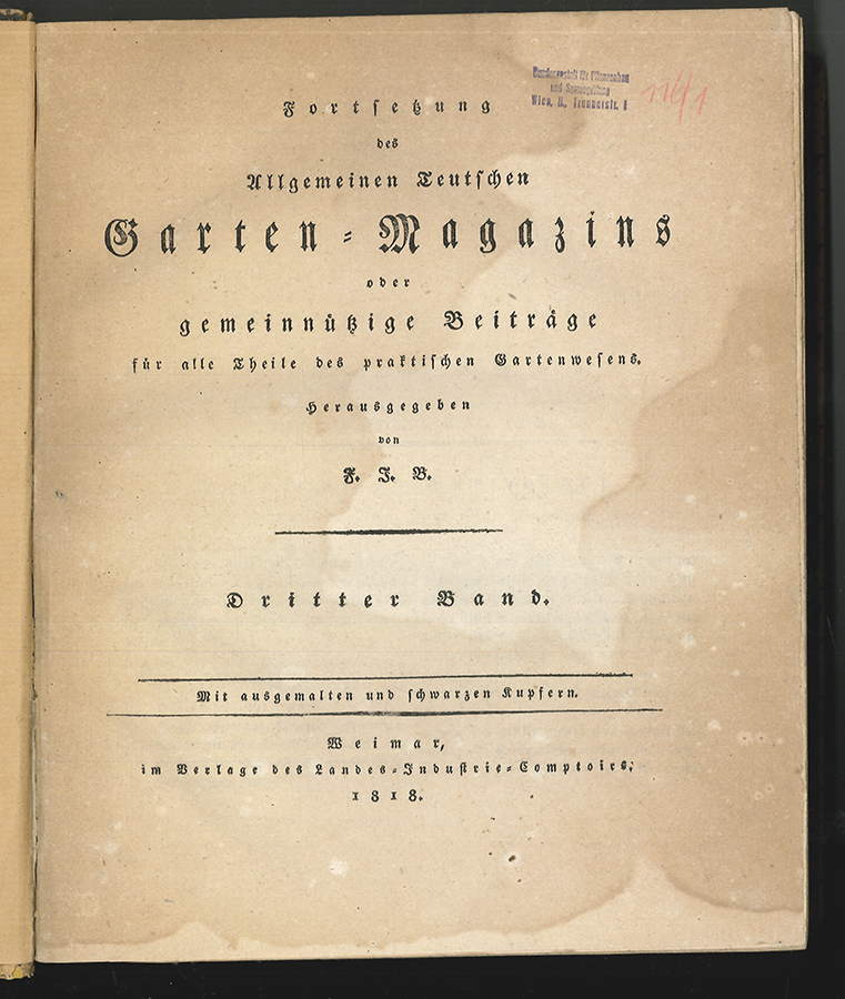 1601-25 B[ERTUCH], F[riedrich] J[ustin]. Fortsetzung des Allgemeinen teutschen Garten-Magazins oder gemeinnützige Beiträge für alle Theile des praktischen Gartenwesens. Dritter und vierter Band der Fortsetzungsreihe des "Allgemeinen teutschen Garten-Magazins oder gemeinnützige Beiträge für alle Theile des praktischen Gartenwesens" von Friedrich Justus Bertuch (1747-1822). Mit einem Anhang "No. II. Intelligenz-Blatt", Vierter Band 1819. Die Fortsetzung des Allgemeinen teutschen Garten-Magazins" folgte auf das seit 1804 erscheinende Magazin und wurde bis 1824 fortgeführt. Band 3 umfasst VI "Stücke", erschienen 1818-1819, Band 4 umfasst ebenfalls VI "Stücke", erschienen von 1819-1820. Die Tafeln in feinem, kräftigen Kolorit. | |||