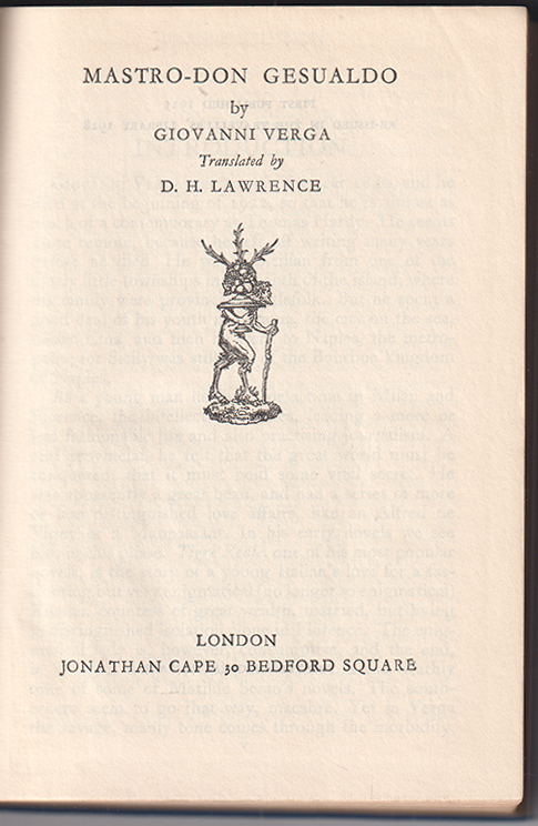 1615-25VERGA, Giovanni Mastro-Don Gesualdo. Translated by D. H. Lawrence. Re-Issuued 1928. London, Jonathan Cape/Travellers' Library (1928). kl.-8°. XXVI, 454 S. 12 Bll. (List of volumes issued in the travellers' library). OLn. m. Rückengoldpräg. (The Travellers' Library) | |