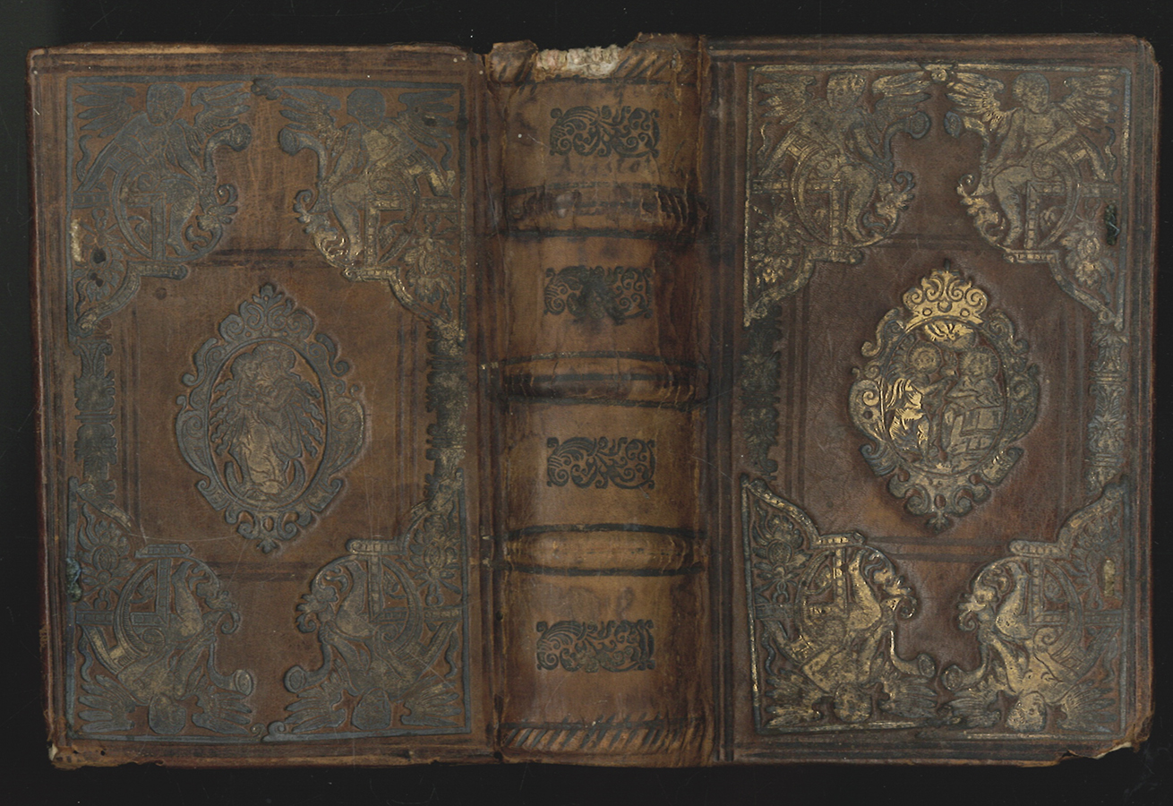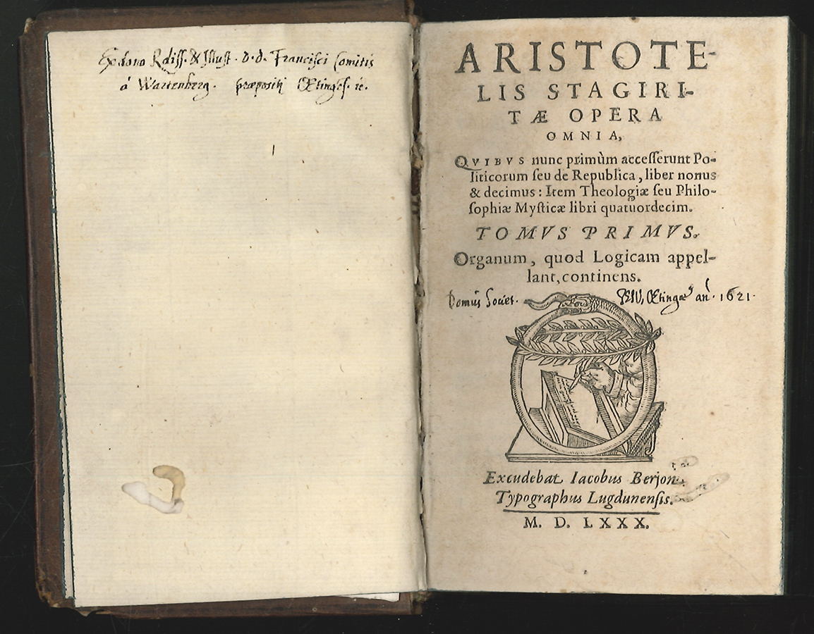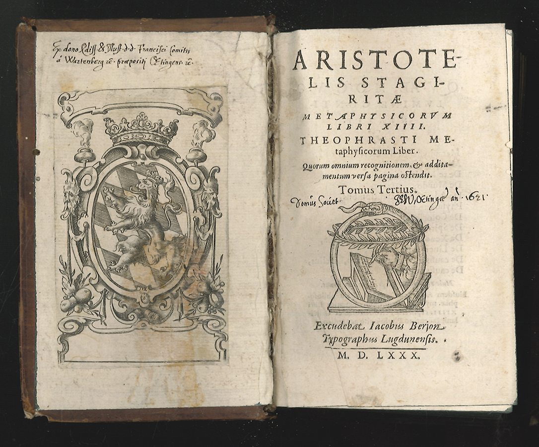1645-25 ARISTOTELES. Aristotelis stagiritae opera omnia, quibus nunc primum accesserunt politicorum seu republica [...]. Graesse I, 216 - Komplett in 7 Bänden seltene Ausgabe der Werke des Aristoteles (4. Jhdt. v. Chr.), die bei Jacobus Berjon in Lyon erschien. Bei Band 7 handelt es sich um einen umfangreichen Registerband. Die Besitz- und Schenkungsvermerke aus dem Jahr 1621 belegen, dass die Bände als Geschenk von Franz Wilhelm Kardinal Reichsgraf von Wartenberg (1593-1661) in den Besitz des ehemaligen "Domus Societ. Jesu, Oetingen, an. 1621" gelangten, das wohl auch über eine Bibliothek verfügt hat. In der Chronik der Stadt Oetting, speziell der Pfarrkirche St. Sebastian ist eine Übernahme der Seelsorge durch die Jesuiten erst für 1644 belegt. Über Verwandtschaft des Graf Wartenberg mit dem Haus Oettingen-Spielberg gelangte 1684 auch eine Knochenreliquie des Hl. Sebastians in die Pfarrkirche St. Sebastian. Graf Wartemberg hatte diese Reliquie zuvor Graf Franz Albrecht zu Oettingen-Spielberg geschenkt. Die Einbände sind reich goldgeprägt und zeigen auf den Vorderdeckel im Mittelmedaillon eine Verkündigungsszene und am hinteren Deckel eine Mondsichelmadonna. Die Ecken werden jeweils von einem Engel mit Posaune geziert. Die Stempel erinnern stark an vergleichbare Stempel des bayerischen Raumes, etwa an die über die Einbanddatenbank nachweisbare Augsburger Werkstatt (München ESlg/P.lat. 457 a). Das Exlibris zeigt das Wappen der Grafen von Wartenberg. | ||||