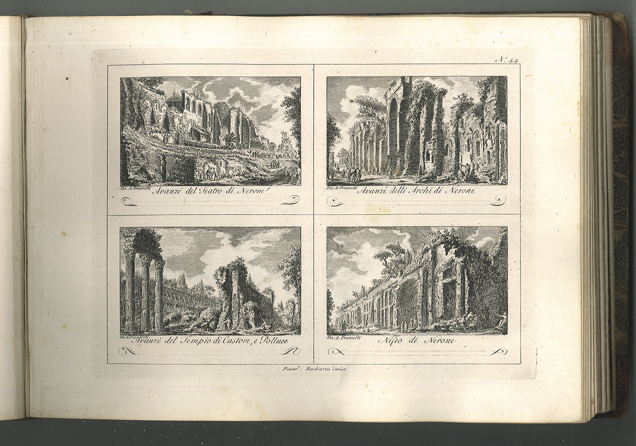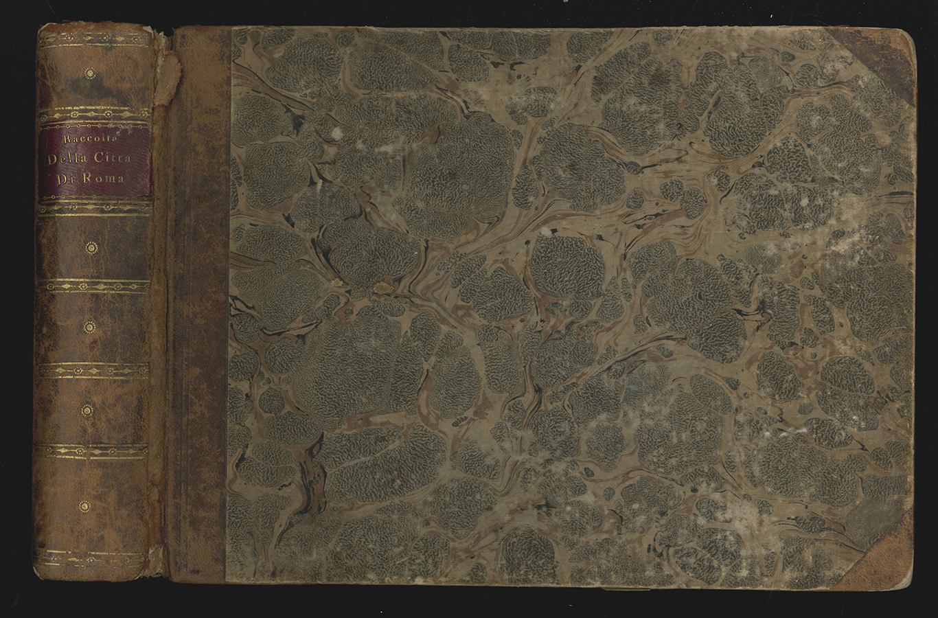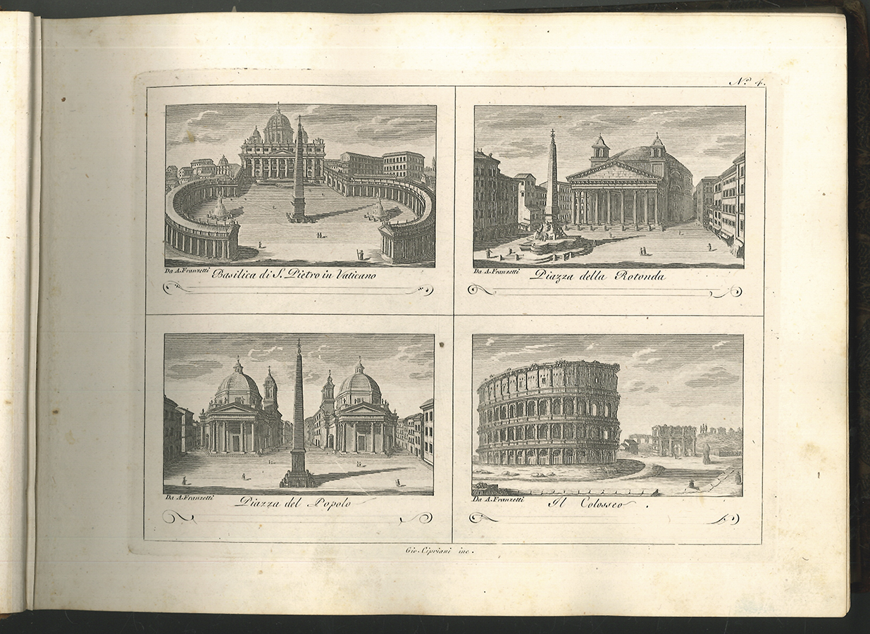 1653-25 ROMA - Raccolta di Num. deg 320 Vedute si antiche, che moderne della citta di Roma e di alcuni luoghi suburbani Incise a bulino in N.deg 80 rami. Umfangreiches Werk mit 320 Ansichten von Roms antiken und neueren Sehenswürdigkeiten auf 80 Tafeln. Die Tafeln stammen u. a. von Giovanni Battista Cipriani , Francesco Morelli und Antonio Giuseppe Barbazza. Aus dem Besitz des Augsburger Stadtbaurates Franz Joseph Kollmann (1800-1894), mit dessen Notizen, teils auf den Versoseiten der Tafeln oder auch zu Beginn und am Schluss im Register. | ||||||