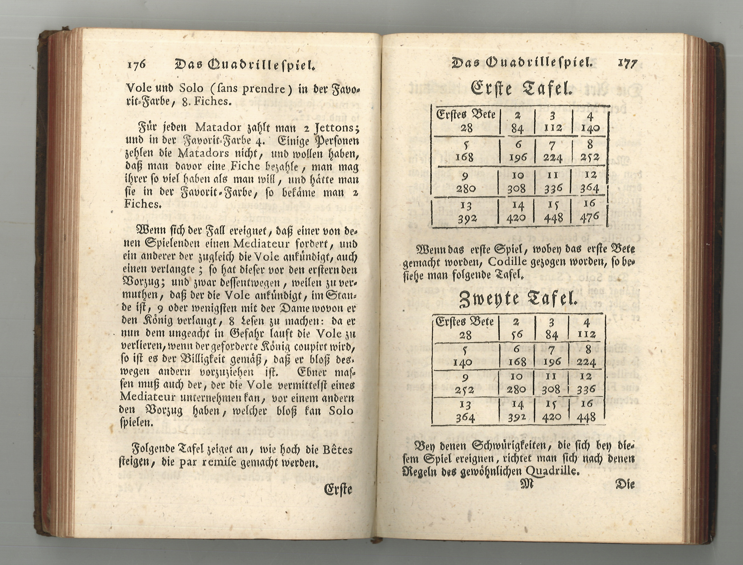1660-25 [Die Kunst die Welt erlaubt mitzunehmen in den verschiedenen Arten der Spiele, so in Gesellschaften hoheren Standes, besonders in der kayserlich-koniglichen Residenz-Stadt Wien üblich sind [...]]. Erste Ausgabe des zweiten Bandes dieses sehr seltenen Werkes zu spätbarocken Gesellschaftsspielen, mit besonderem Fokus auf Wien. Besprochen werden u. a. das Mailspiel, Cavagnola, Quadrille, Taroc, Cucu, Guinguette und "Neuerfundene Kartenkünste". Das Wappensupralibros zeigt einen viergeteilten Wappenschild, 2 Felder mit Einhorn, zusätzlich mit Monogramm "GMvH". Es fehlt das Titelblatt. | |||