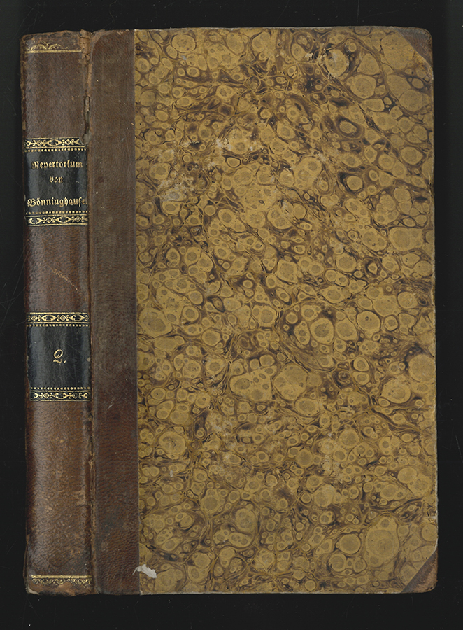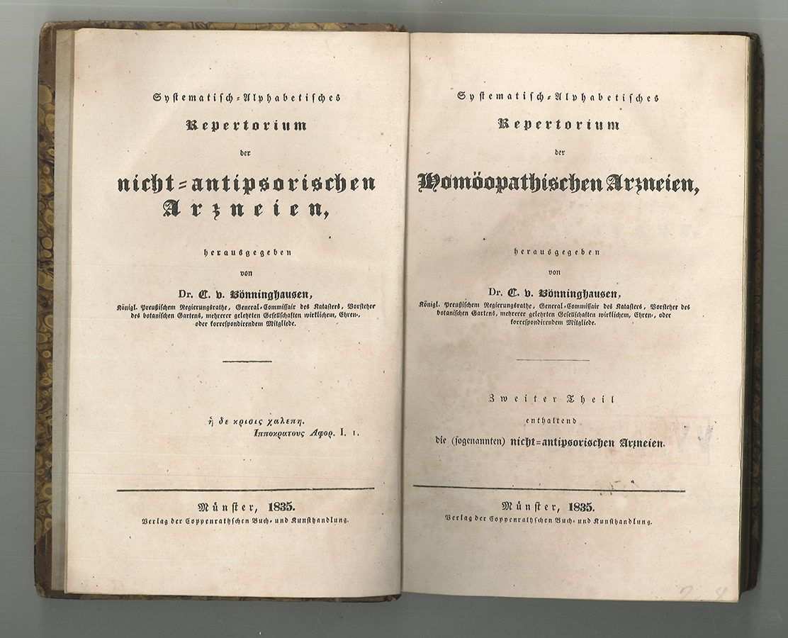 1678-25 BÖNNINGHAUSEN, C[lemens Maria] v[on]. Systematisch-alphabetisches Repertorium der homöopathischen Arzneien. Ertsausgabe des zweiten Bandes von Clemens Maria Franz von Bönninghausen (1785-1864) umfangreichem Werk zu homöopathischen Arzneimitteln. Der vorliegende 2. Band umfasst "die (sogenannten) nicht-antipsorischen Arzneien". | |||