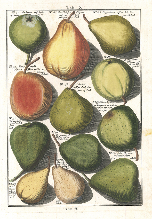 1688-25 SELIGMANN, J[ohann] M[ichael]. - [Birnensorten] Tab. X. Ambrette reif im Oct[ober] gewogen 3 Loth, Bon Chretien d'hyver reif im Oc[tober] gewogen 13 Loth [...]. Zu sehen sind u. a. folgende Sorten: "Salviati", "Saint Germain", "Virgouleuse" oder auch "Ambrette". Aus: Johann Hermann Knoop/Georg Leonhard Huth (Übers.), Pomologia, das ist Beschreibungen und Abbildungen der besten Sorten der Aepfel und Birnen, welche in Holland, Deutschland, Franckreich, Engeland und anderwärts in Achtung stehen, und deswegen gebauet werden [...], Nürnberg 1766, Teil II. | ||