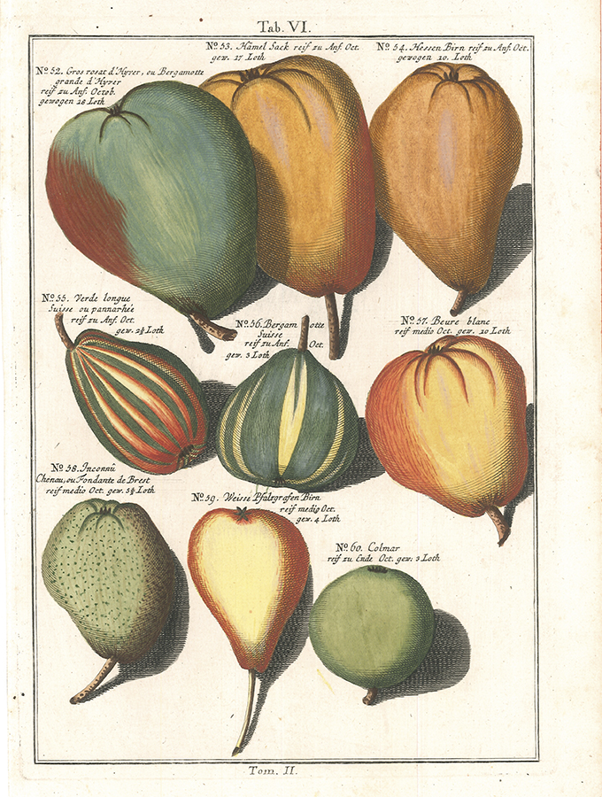 1696-25 SELIGMANN, J[ohann] M[ichael]. - [Birnensorten] Tab. VI. Gros rosat d'Hyver, ou Bergamotte [...], Hämel Sack reif zu Anf. Oct[ober] gew. 17 Loth [...] Zu sehen sind u. a. folgende Sorten: "Verde longue", "Colmar", "Weisse Pfalzgrafen Birn" oder auch "Hessen Birn". Aus: Johann Hermann Knoop/Georg Leonhard Huth (Übers.), Pomologia, das ist Beschreibungen und Abbildungen der besten Sorten der Aepfel und Birnen, welche in Holland, Deutschland, Franckreich, Engeland und anderwärts in Achtung stehen, und deswegen gebauet werden [...], Nürnberg 1766, Teil II. | ||