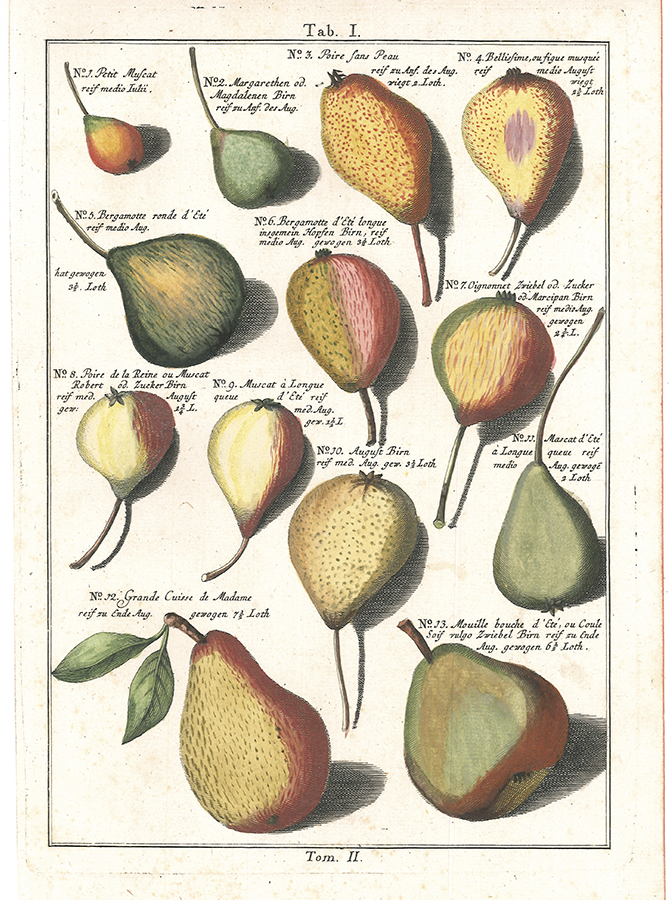 1699-25 SELIGMANN, J[ohann] M[ichael]. - [Birnensorten] Tab. I. Petit Muscat, reif medio Julii, Margarethen od. Magdalenen Birn, reif zu Anf. des Aug. [...]. Zu sehen sind u. a. folgende Sorten: "August Birn", "Grande Cuisse de Madame", "Oignonnet Zwiebel od. Zucker od. Marcipan Birn" oder auch "Bergamotte ronde d' Eté". Aus: Johann Hermann Knoop/Georg Leonhard Huth (Übers.), Pomologia, das ist Beschreibungen und Abbildungen der besten Sorten der Aepfel und Birnen, welche in Holland, Deutschland, Franckreich, Engeland und anderwärts in Achtung stehen, und deswegen gebauet werden [...], Nürnberg 1766, Teil II. | ||