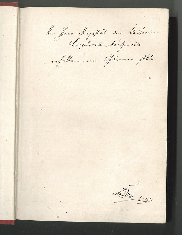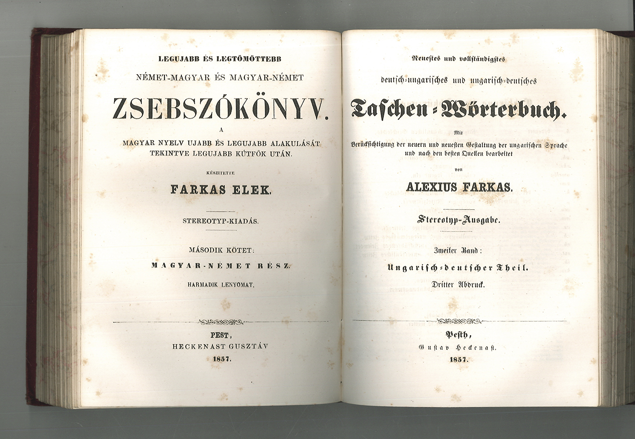 1707-25 FARKAS, Alexius/Elek. Neuestes und vollständigstes deutsch-ungarisches und ungarisch-deutsches Taschen-Wörterbuch. Mit Berücksichtigung der neuern und neuesten Gestaltung der ungarischen Sprache und nach den besten Quellen bearbeitet. Legujabb és legtömöttebb német-magyar es magyar-német Zsebszokönyv. A magyar nyelv ujabb és legujabb alakulását tekintve legujabb kútfök utá [...]. Deutsch-ungarisches/ungarisch-deutsches Wörterbuch von Alexius/Elek Farkas. Flieg. Blatt mit Vermerk: "Von Ihrer Majestät der Kasierin Carolina Augusta erhalten am 1. Jänner 1862. E. v. Paris". Karoline Charlotte Auguste von Bayern (1792-1873) heiratete 1816 Franz I. von Österreich und lebte nach seinem Tod 1835 als Kaiserinwitwe hauptsächlich in Salzburg. | |||||