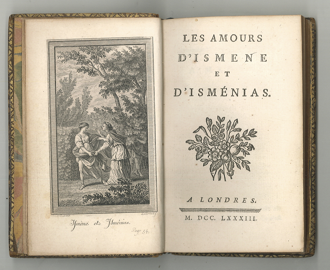 1741-25[MAKREMBOLITES, Eustathios]. Les amours d'Ismene et d'Isménias. London, 1783 [i. e. Paris, Cazin 1783]. 12°. Titel, VIII, 136 S. Mit gest. Frontispiz. Ldr. d. Zeit mit goldgeprägtem Rückentitel. Vorsätze aus Schneckenmarmorpapier, umlaufender Goldschnitt. Rücken und Kanten berieben, Schmutztitel mit kl. Exlibris. Mit falschem Druckort erschienene Ausgabe von Eustathios Makrembolites (12. Jhd.) Roman. | |