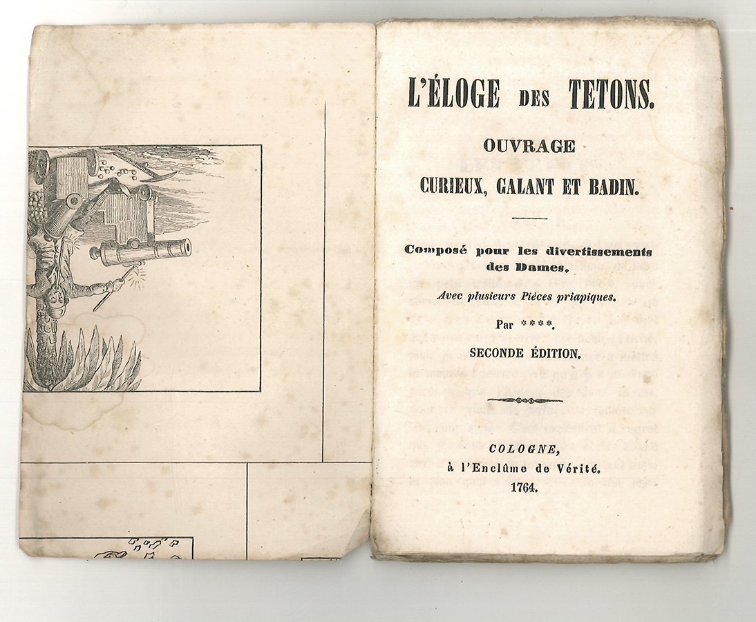 Éloge des tetons. Ouvrage curieux et galant et badin. Seconde édition. Composé pour les divertiments des Dames. Köln [fingiert], Enclume de Vérité 1764. 12°. Titel, 151 S. Interimsbroschur der Zeit aus Makulatur-Graphik Gebräunt, etwas stockfleckig, unbeschnitten.