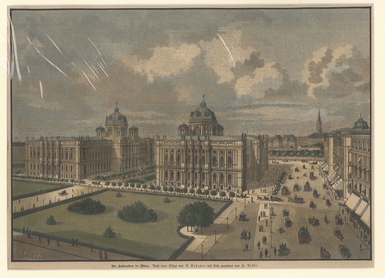 Ansicht des Naturhistorischen und Kunsthistorischen Museums in Wien. Nach einem Entwurf von A. Krüzner.