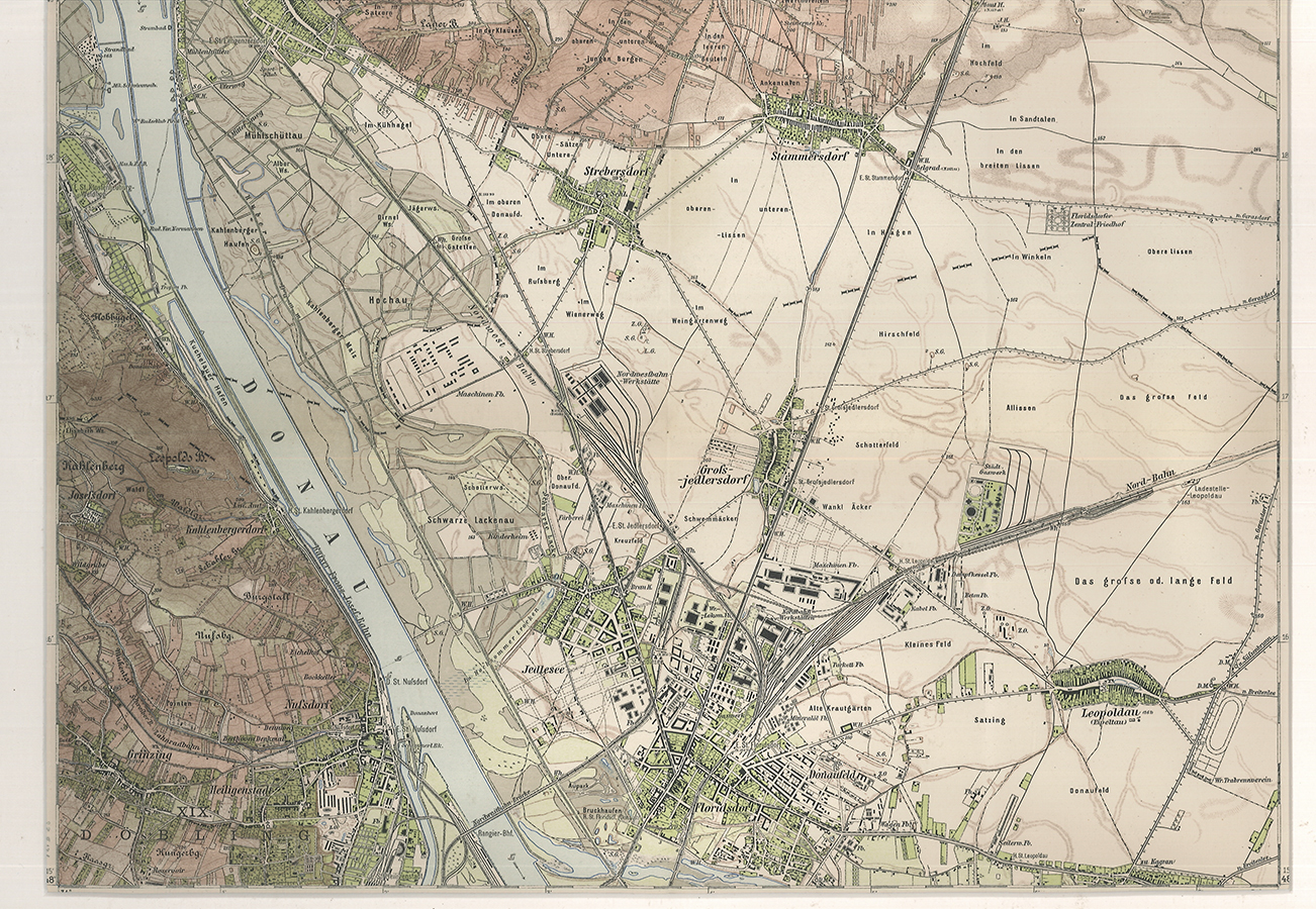 1794-25WIEN - [Donaufeld-Floridsdorf-Gross Jedlersdorf-Langenzersdorf-Leopoldau-Stammersdorf-Strebersdorf].Farblithographie. [Wien, o. Verlag nach 1872]. ca. 28 x 37 cm. (Bildausschn.). Unter Passepartout. Gut erhalten. Karte vom Floridsdorf und Umgebung.