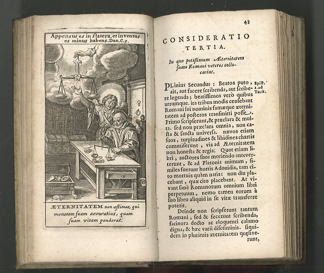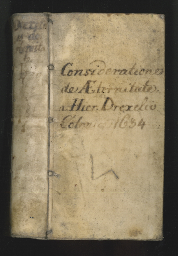 1834-25 DREXEL, Jeremias. De Aeternitate considerationes: coram Ser[enissi]mo utriusq[ue] Bavariae Duce S.R.I. Archidapifero, Electore, Maximiliano et Ser[enissi]ma coniuge Elisabetha explicatae [...] De Backer-Sommervogel III, 182, 3; VD17 1:074638L; vgl. Praz, S. 318 - Kölner Ausgabe des erstmals 1620 erschienenen Werkes des Jesuiten Jeremias Drexel (1581-1638), der zahlreiche Erbauungsschriften verfasste und ein starker Befürworter der Hexenverfolgung war. Einer der Vorbesitzer, Bernhard Modersohn, war um 1736 Vikar zu Ostbevern. | ||||