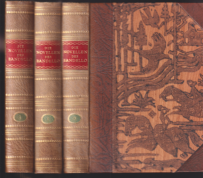1882-25RENNER - BANDELLO. Die Novellen des Bandello. Zum erstenmal vollständig ins Deutsche übertragen. 3 Bde. München, G. Müller 1920. XXXVIIII, 320 (1); 324 (1), VII, 336 (1) S. Mit 18 lithogr. Taf. v. Paul Renner. OHLdr.-Bde. mit Rückengoldpräg. u. Rückensch. (Perlen älterer romanischer Posa, hrsg. v. Hanns Floerke u. Alb. Wesselski, Bd. XXVII-XXIX) Eines von 800 Expl. | |