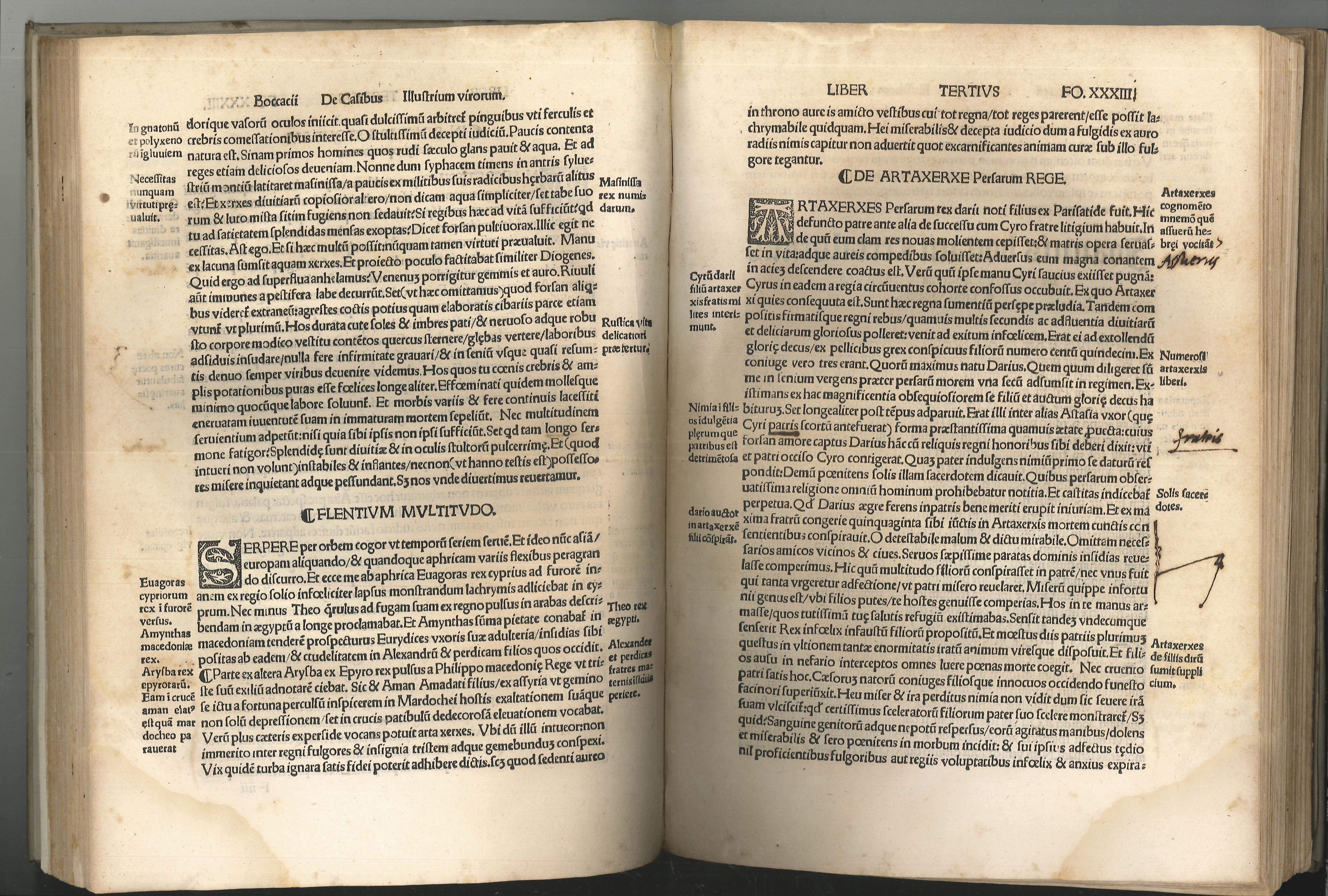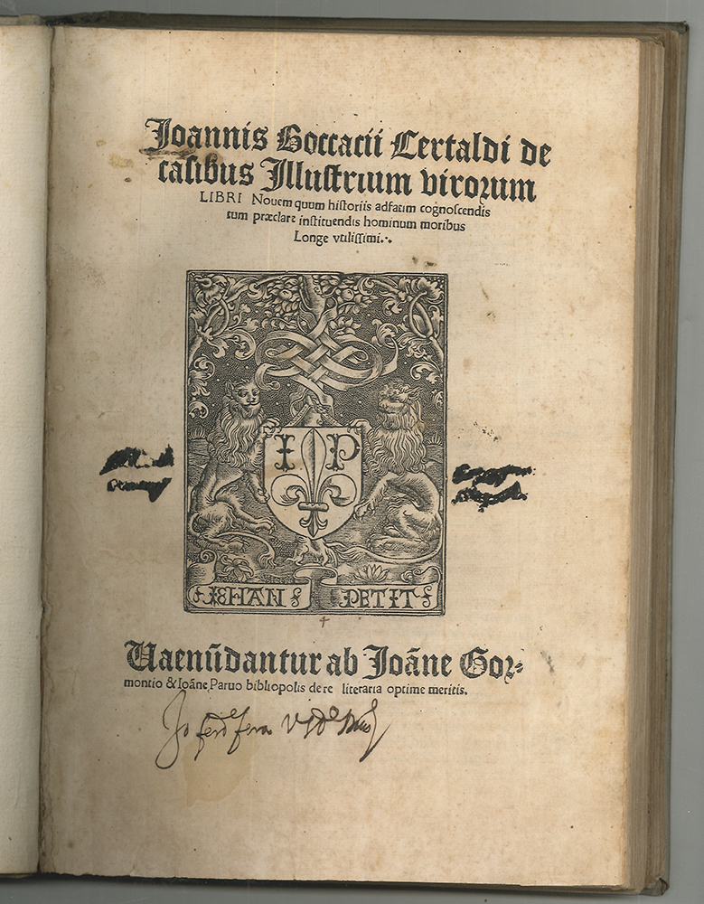 1902-25 BOCCACCIO, Giovanni di - (THEODORICUS/THIERRY, Johannes/Jean). Joannis Boccacii Certaldi de casibus Illustrium virorum Libri Novem quum historiis adfatim cognoscendis tum praeclare instituendis hominum moribus longe utilissimi [...]. vgl. Graesse I, 446 (spätere Aufl.).; British Museum Cat. French Books, p. 71 - Sehr seltene lateinische Pariser Ausgabe von Giovanni Boccacios (1313-1375) Biographien-Sammlung "De casibus illustrium virorum", die er ab der Mitte der 1350er Jahre zusammenstellte. Die vorliegende Ausgabe wurde von Jean Thierry herausgegeben. Letztes Blatt mit einer kurzen Vita Boccaccios. | ||||||