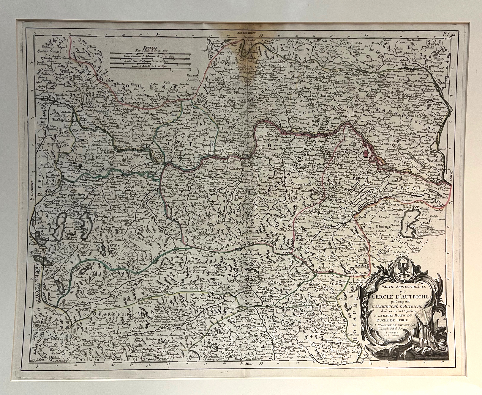 1909-25 VAUGONDY, [Didier] Robert de. Partie Septentrionale du Cercle d'Autriche qui Comprend l'Archiduche d'Autriche divise en ses huit Quartiers et la Haute Partie du Duche de Stirie [...]. Von Paolo Santini herausgegebene Karte von Teilen Österreichs von Didier Robert de Vaugondy (1723-1786), Sohn von Gilles Robert Vaugondy. Zeigt das Gebiet von Passau bis St. Michael im Lungau und Nikolsburg bis zum Neusiedler See. | ||