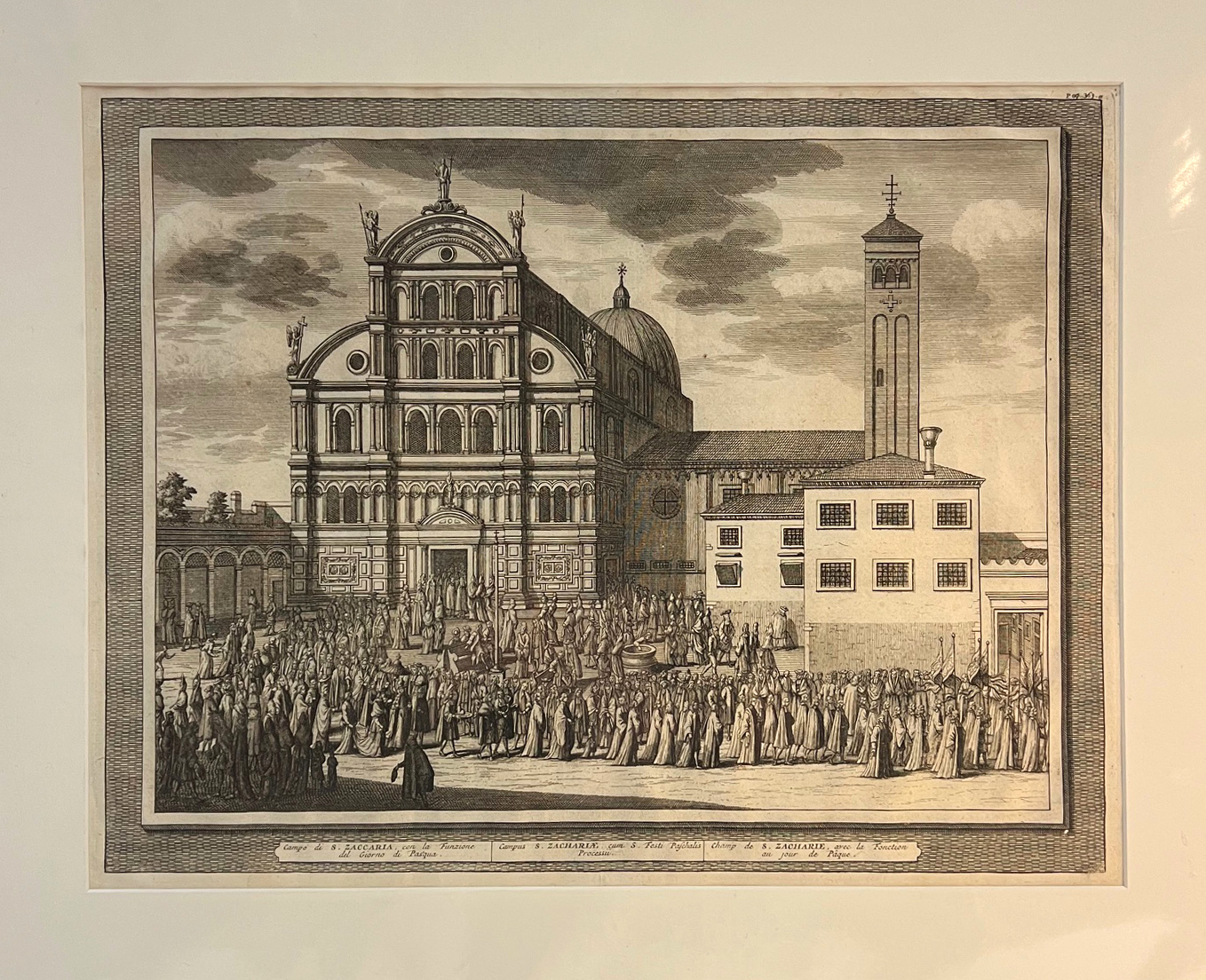 1928-25 VENEDIG - [CARLEVARIJS, Luca (nach)]. Campo di S. Zaccaria, con la Fuzione del Gioro di Pasqua/ Campis S. Zachariae, cum S. Festi Paschalis Processu/Camp de S. Zacharie, avec la fonction au jour du Paque. Ansicht der Kirche "San Zaccaria" in Venedig, mit Osterprozession. Der Kupferstich stammt aus: Johann Georg Graevius, "Thesaurus Antiquitatum et Historiarum Italiae". | ||