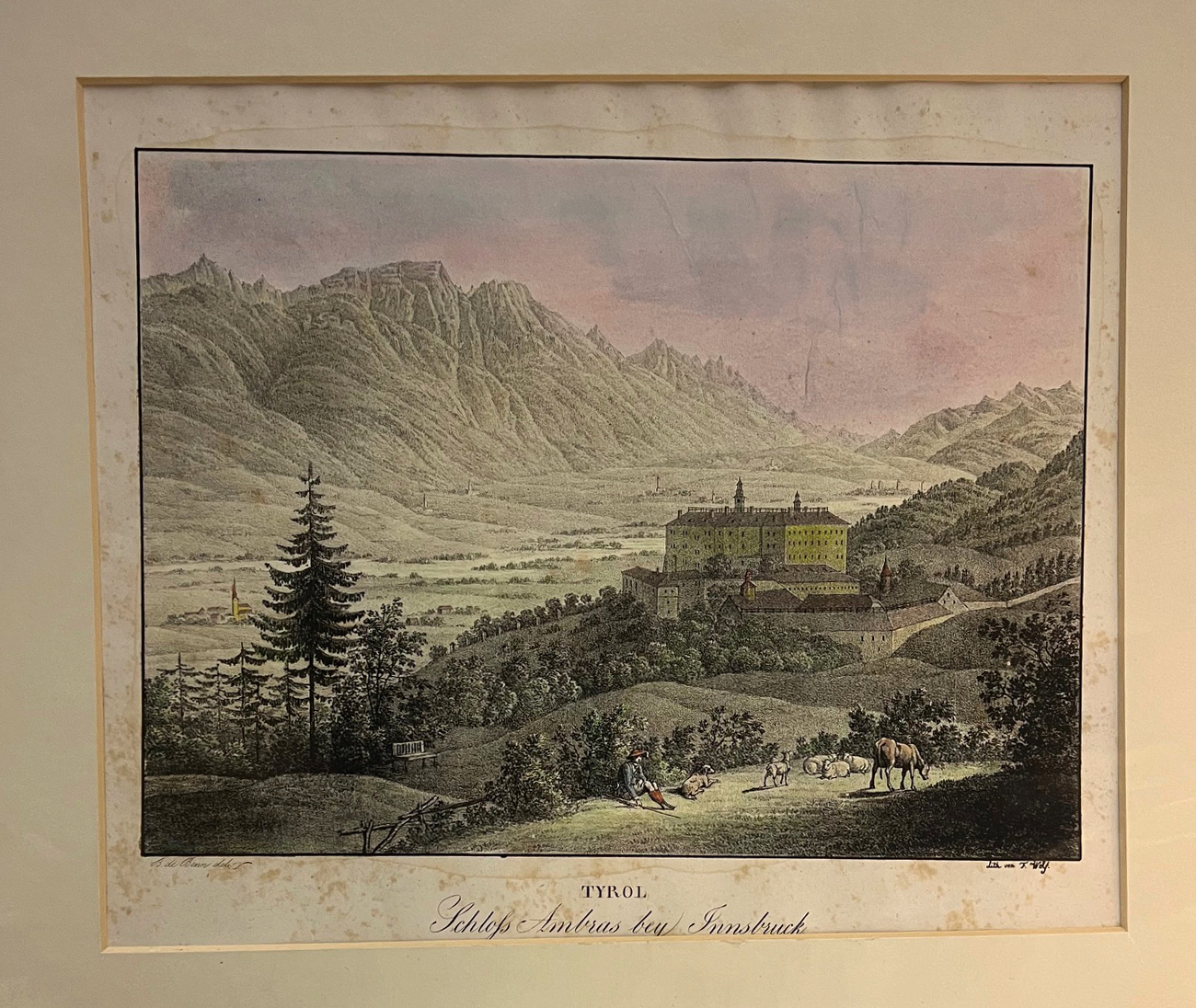 Tyrol. Schloss Ambras bey Innsbruck. Altkol. Lithographie. [Wien, Adolph Kunike um 1830]. 30 x 37,5 cm (Blattgr.). Unter Passepartout. Stockfleckig. Kolorit mit grün-gelb-Stich.