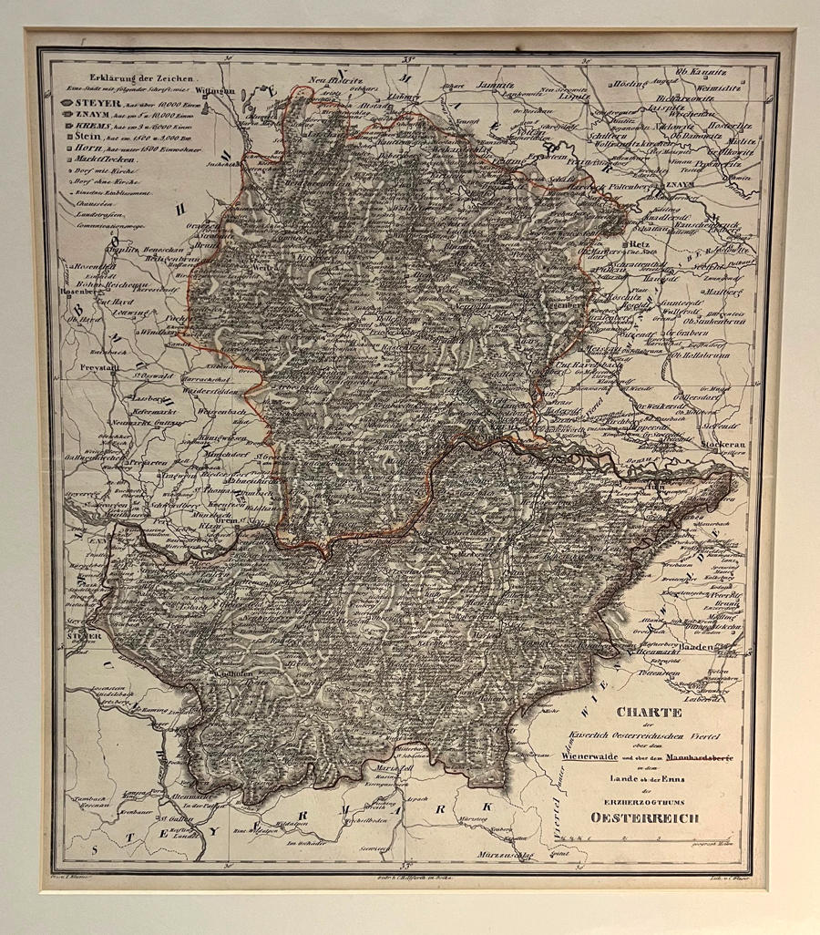 1943-25 BLUME, J. - GLASER, C. Charte der Kaiserlich Oesterreichischen Viertel ober dem Wienerwalde und ober dem Mannhardsberge in dem Lande ob der Enns des Erzherzogthums Oesterreich Karte von Wienerwald und dem Viertel um den Manhartsberg. Zeigt das Gebiet von Wittingau bis St. Gallen und Znaim bis Mürzzuschlag. | ||