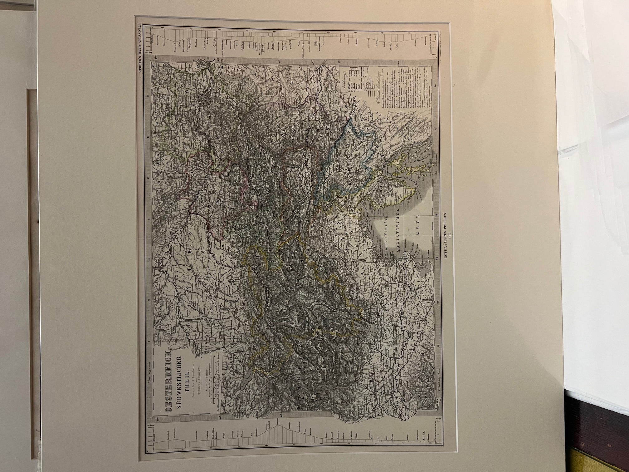 Oesterreich südwestlicher Theil. Alt grenzkolorierte, gest. Karte. Gotha, J. Perthes 1876. 30, 8 x 43 cm (Blattgr.). Unter Passepartout. Mit mittiger Faltspur, gut erhalten.