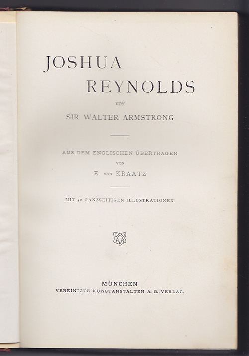 2217-12REYNOLDS - ARMSTRONG, Walter. Joshua Reynolds. Aus dem Englischen übertragen v. E. v. Kraatz. Mchn., Vereinigte Kunstanstalten o. J. [ca. 1907]. gr.-8°. 6 Bll., 242, XIV S. 52 Taf., davon 12 in Kupfertiefdruck OLn. Mit Goldpräg., Mit kl. Läsion am Rücken. | |