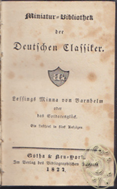 2533-12 LESSING, (Gotthold Ephraim). Minna von Barnhelm oder Soldatenglück. Ein Lustspiel in fünf Aufzügen. Beigebunden: 1: LEISEWITZ. Julius von Tarent. Ein Trauerspiel in fünf Acten. Ebda. 1828. - 2: KLEIST, Heinrich. Kätchen von Heilbronn. (Ritterschauspiel.). Ebda. 1831. 208 S. | |||