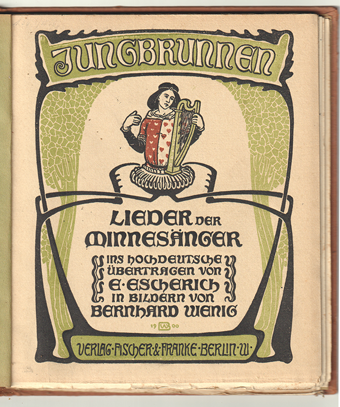 2626-21 WENIG - ESCHERICH, E(milie). (Übers.) Lieder der Minnesänger. Ins Hochdeutsche übertragen von E. Escherich, in Bildern von Bernhard Wenig. Bernhard Wenig (1871-1936) besuchte die Kunstgewerbeschule und Akademie in München, Franz von Stuck gehörte zu seinen Lehrern. | |||