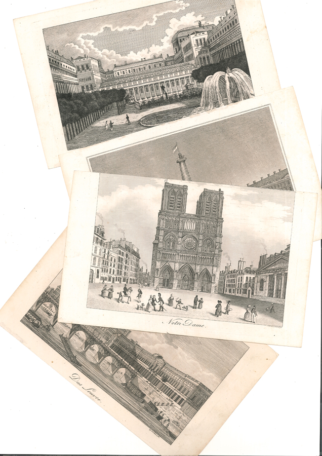 2747-21PARIS - 4 Stadtansichten.3 Kupferstiche und 1 Stahlstich gest. v. Neubauer u. a. . o. O. [ca. 1840]. ca. 14 x 21 cm. Die Ansichten zeigen den Louvre, Palais Royal, Notre Dame, Place Vendome (Stahlst.).