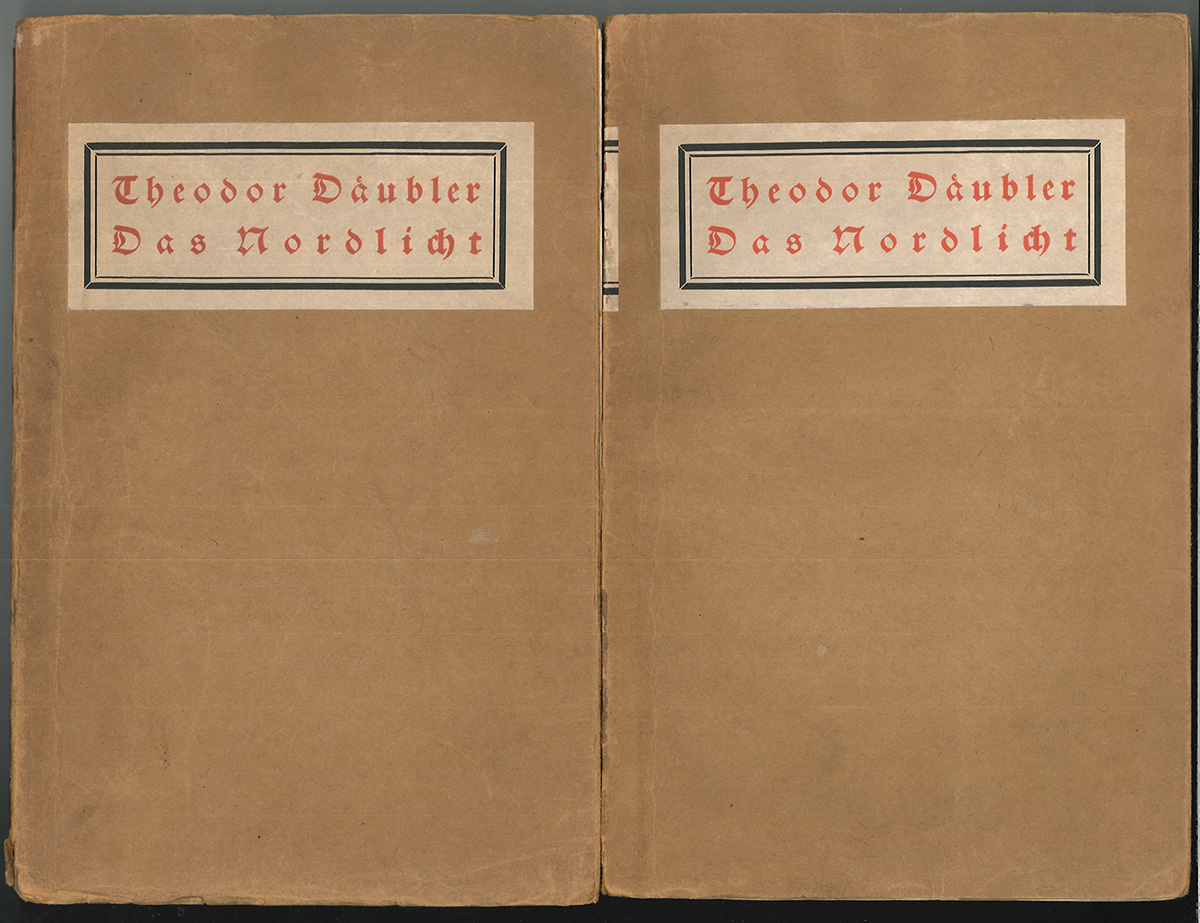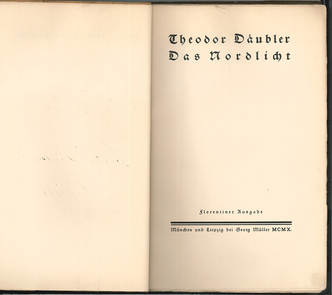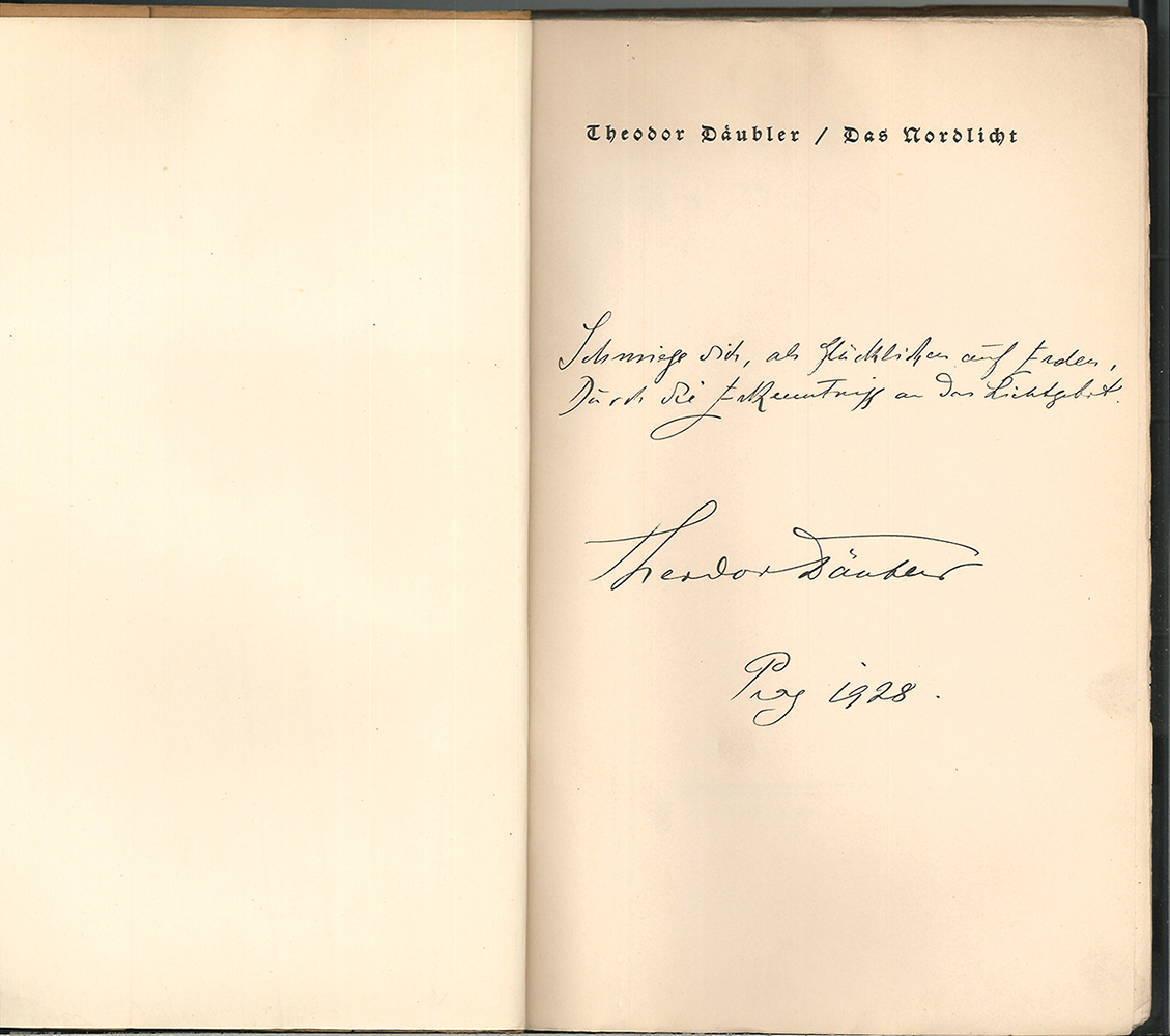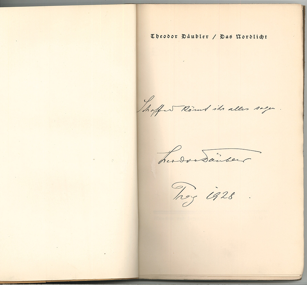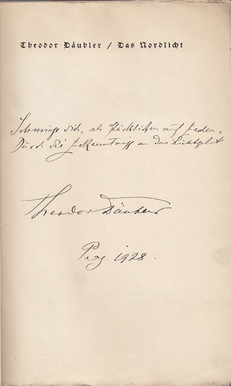 2967-11 DÄUBLER, Theodor. Das Nordlicht. W.-G.² 1; Raabe 45.2; Zehnjahreskat. G. Müller S. 79 - Erstausgabe des Erstlingswerkes. Mit je einem kurzen eigenh. Gedicht des Verfassers a. d. Vortit. jeden Bandes, datiert 1928. - Die ab 1910 erschienen ersten Werke Theodor Däublers (1876 in Triest - 1934) wurden von den Dichtern des gerade aufkommenden Expressionismus begeistert aufgenommen. "Das Nordlicht", ein wortmächtiges Versepos, an dem Däubler bereits seit 1898 gearbeitet hatte, wurde 1916 von dem jungen Philosophen Carl Schmitt in einer Monographie enthusiastisch besprochen. Kasimir Edschmid schrieb 1920 über Däubler: "Er ist einer der von innen Leuchtenden, selbst das Dunkle und Wirre hat den einfachen Reiz". | ||||||||