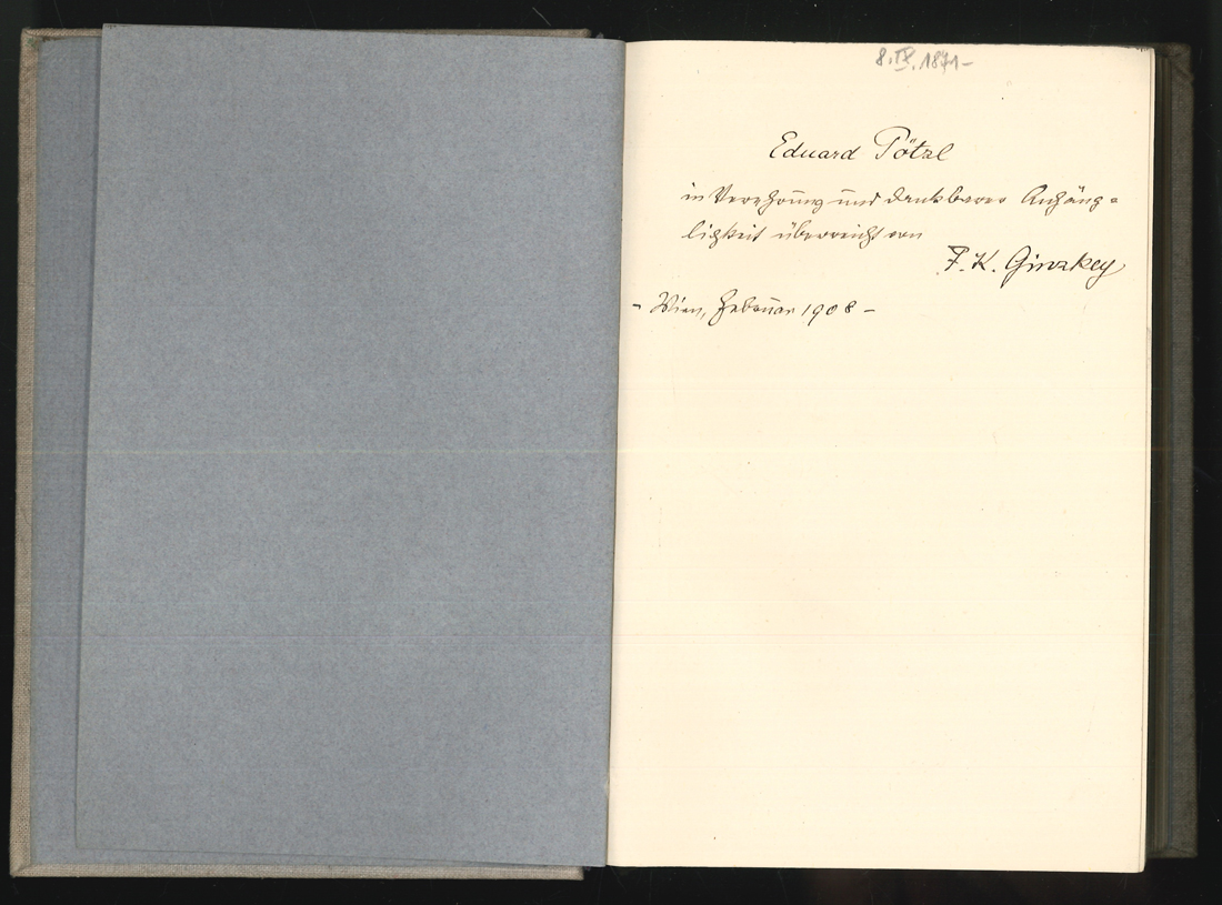 Mit eigenhänd., mehrzeil. Widmung des Verf. an den österr. Feuilletonisten Eduard Pötzl, (1851-1914).