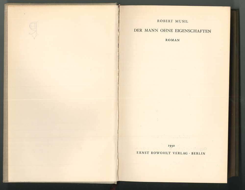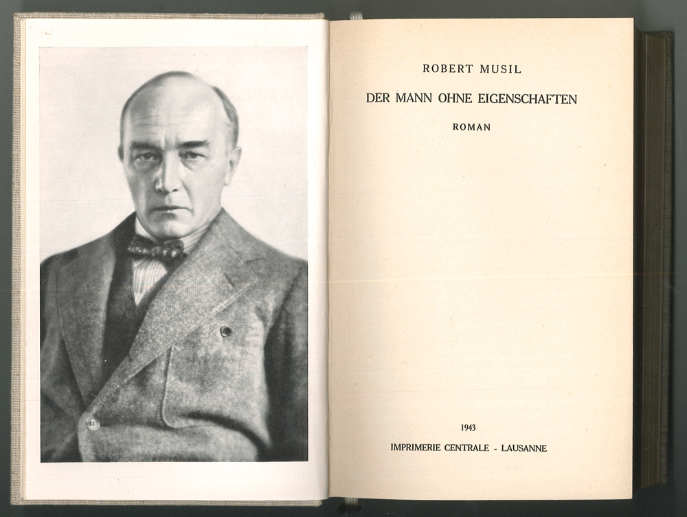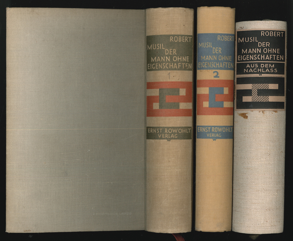 0007-26 MUSIL, Robert. Der Mann ohne Eigenschaften. Roman. W.-G.² 10 - Erstausgabe aller drei Bände von Robert Musils (1880-1942) wohl bekanntestem Werk, das unvollendet blieb. Musil erlangte damit Weltruhm. "Der Abstand dieses 'Mannes ohne Eigenschaften' von aller bisherigen deutschen Romanliteratur ist unermeßlich. Keine Zeile dieser 1075 Seiten läuft leer, jede ist wichtig für das strukturelle Ganze dieses unvergleichlichen Werkes. Was steht darin? Die ganze heutige Welt." (Franz Blei). - Die Erstausgabe des ersten Bandes war 1930 erschienen. Der zweite Band 1933. Der dritte Band erschien in kleiner Auflage erst aus dem Nachlass 1943. Er enthält ein Titelportrait und ein erklärendes Vorwort v. Martha Musil. Das Rückenschildchen des letzten Bandes wurde wohl vom Original-Einband kopiert. | ||||