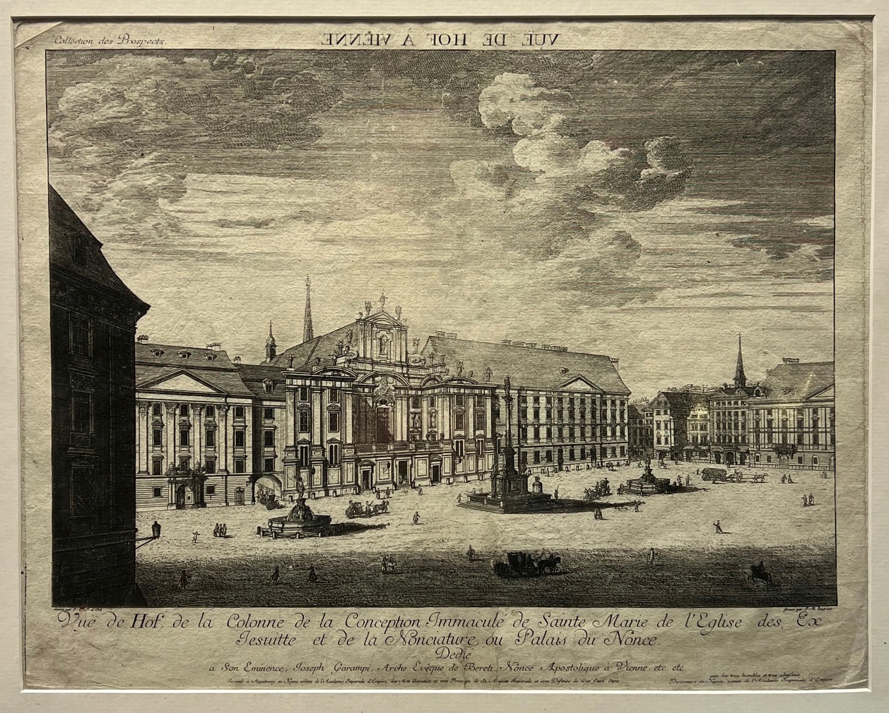0017-26 AM HOF - FISCHER VON ERLACH, J[osef] E[manuel] - SIGRIST, J[ohann] (auch SICRIST). Vue de Hof, da le Colonne de la Conception Immaculé de Sainte Marie de l' Eglise des Ex Jesuitte et da la Nonciature, ou Palais du Nonce [...]. vgl. Nebehay-W. 139/12 - Ansicht des Platzes "Am Hof" in Wien. Aus: "Collection des Prospects", nach dem Stich von Johann Adam Delsenbach. | ||