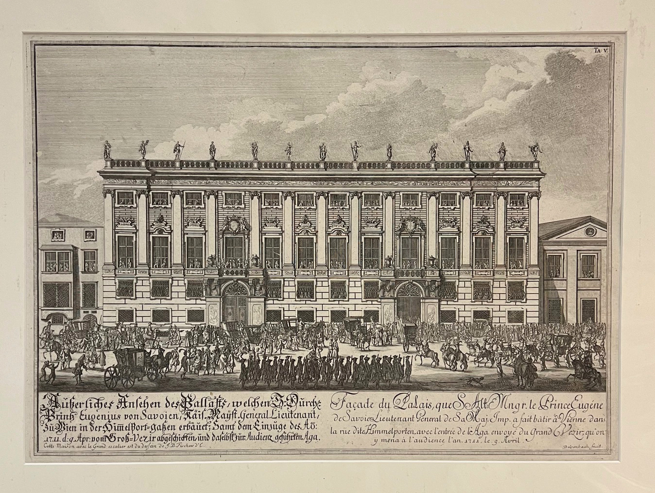 0031-26 AM HOF - FISCHER VON ERLACH, J[osef] E[manuel] - DELSENBACH, [Johann Adam]. Äußerliches Ansehen des Pallasts, welchen S. Durchl. Prinz Eugenius von Savoien, Kaysl. General Lieutenant, zu Wien in der Him(m)elport=Gaßen erbauet [...] Nebehay-W. 176, Teil 4/5 - Ansicht des Winterpalais von Prinz Eugen von Savoyen in Wien. Aus: "Entwurff einer historischen Architektur [...]". Unten rechts in der Platte signiert: "Delsenbach fecit". | ||