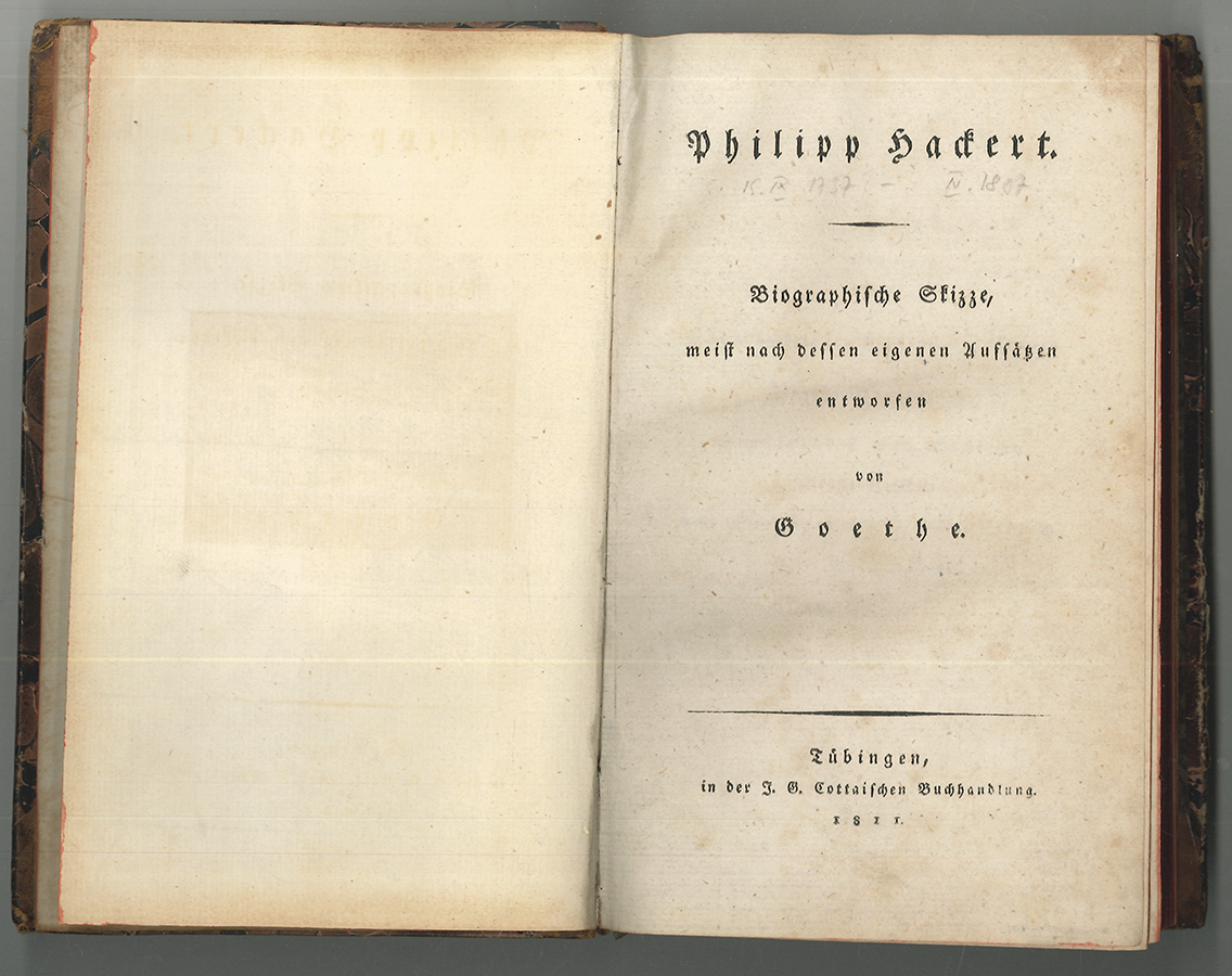 0044-26 GOETHE, [Johann Wolfgang v.]. Philipp Hackert. Biographische Slizze, meist nach dessen eigenen Aufsätzen entworfen von Goethe. Goed. IV, 3, 398, 202; W.-G.² 505, 83 - Erstausgabe von Goethes biographischem Portrait des Malers Philipp Hackert (1737-1807), den er 1786 kennenlernte und in Caserta traf. Mit gedruckter Widmung an die Erbprinzessin Maria Paulowna, Großfürstin von Russland. Goethe schreibt in den "Nachträgen": "Die Nachricht von dem Tode seines verehrten Freundes Philpp Hackert erhielt der Herausgeber zugleich mit einem Packet biographischer Aufsätze, welche ihm der Verewigte in einer früheren und letzten Verordnung zugedacht hatte [...]" (S. 267). Ein Auszug des Werkes erschien bereits vorab im "Morgenblatt für gebildete Stände". Aus der Goetheana-Sammlung des Frankfurter Kaufmannes Heinrich Stiebel (1851-1928). Das vorliegende Exemplar wurde als Lot 475 im 5. Teil der Nachlass-Versteigerung von Stiebel durch Joseph Baer & Co. in Frankfurt am 26./27. Mai 1930 versteigert. | |||