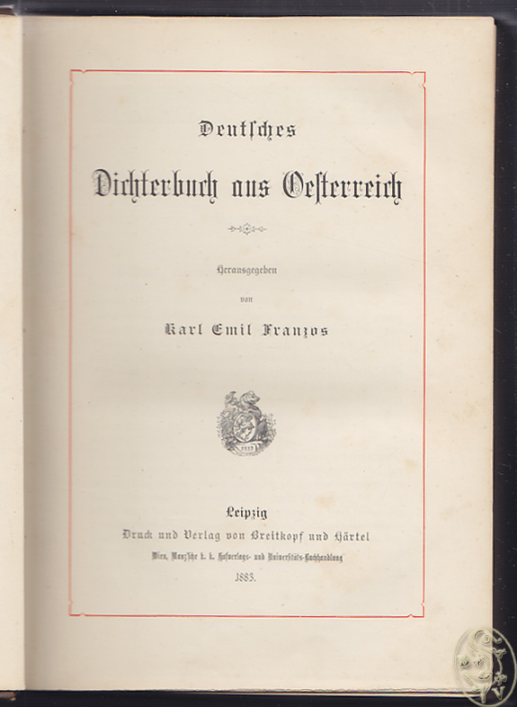 0067-13 FRANZOS, Karl Emil (Hrsg.).  Deutsches Dichterbuch aus Österreich. W.-G.² 10 - Anthologie bis dahin ungedruckter Texte von Grillparzer, Hamerling, Halm, Grün, Bauernfeind, von der Traun, Rollett, Mauthner,Caro, Wickenburg-Almasy, Tandler, Kalbeck, Cerri, Rosegger, Milow, Anzengruber, Meianer, Klaar, Teweles, Bendel, Ohorn.   |     |||