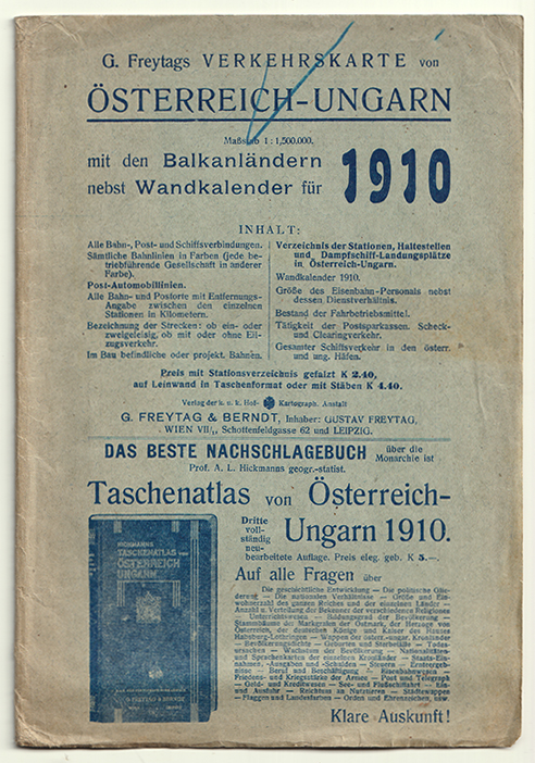 G. Freytags Verkehrskarte von Österreich-Ungarn mit den Balkanländern 1910. .Wien, Freytag & Berndt 1910. 71 : 99 cm. farb. gefalt. farblith. Karte. 1: 1, 500.000.
