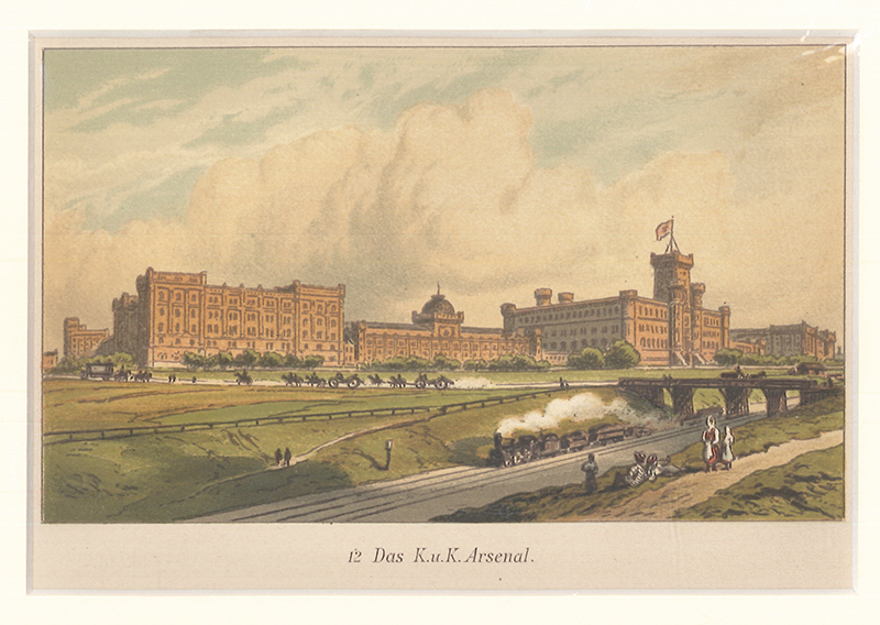 0137-26WIEN - VARRONE, Giovanni - PETROVITS, Ladislaus Eugen. K. K. Arsenal.Chromolithographie Wien, Varrone / Petrovits 1894. 10, 5 x 15, 5 cm. (Bildgr.). Unter Passepartout. Nebehay-W. 772 - Aus: Fünfzig Ansichten von Wien und Umgebung.