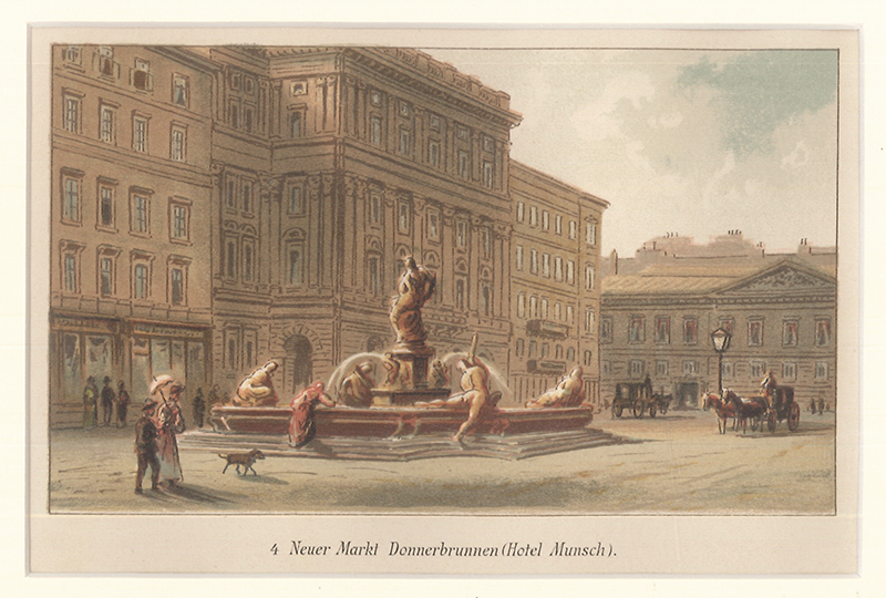 Neuer Markt Donnerbrunnen (Hotel Munsch). [Blick auf das Hotel Munsch heute Abassador]. Chromolithographie Wien, Varrone/Petrovits 1894. 10, 5 x 15, 5 cm. Unter Passepartout.