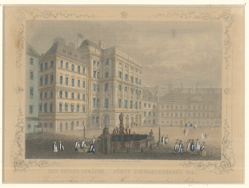 0146-26WIEN - PAYNE, Albert Henry. Das Casino-Gebäude. Fürst Schwarzenberg's Pal: [am Neuen Markt].Kolorierter Stahlstich. Leipzig, Payne 1848. 9, 5 x 13 cm. Payne cs. Unter Passepartout. Nebehay-W. 480a - Aus:Albert Henry Payne: Wien und seine Umgebungen.